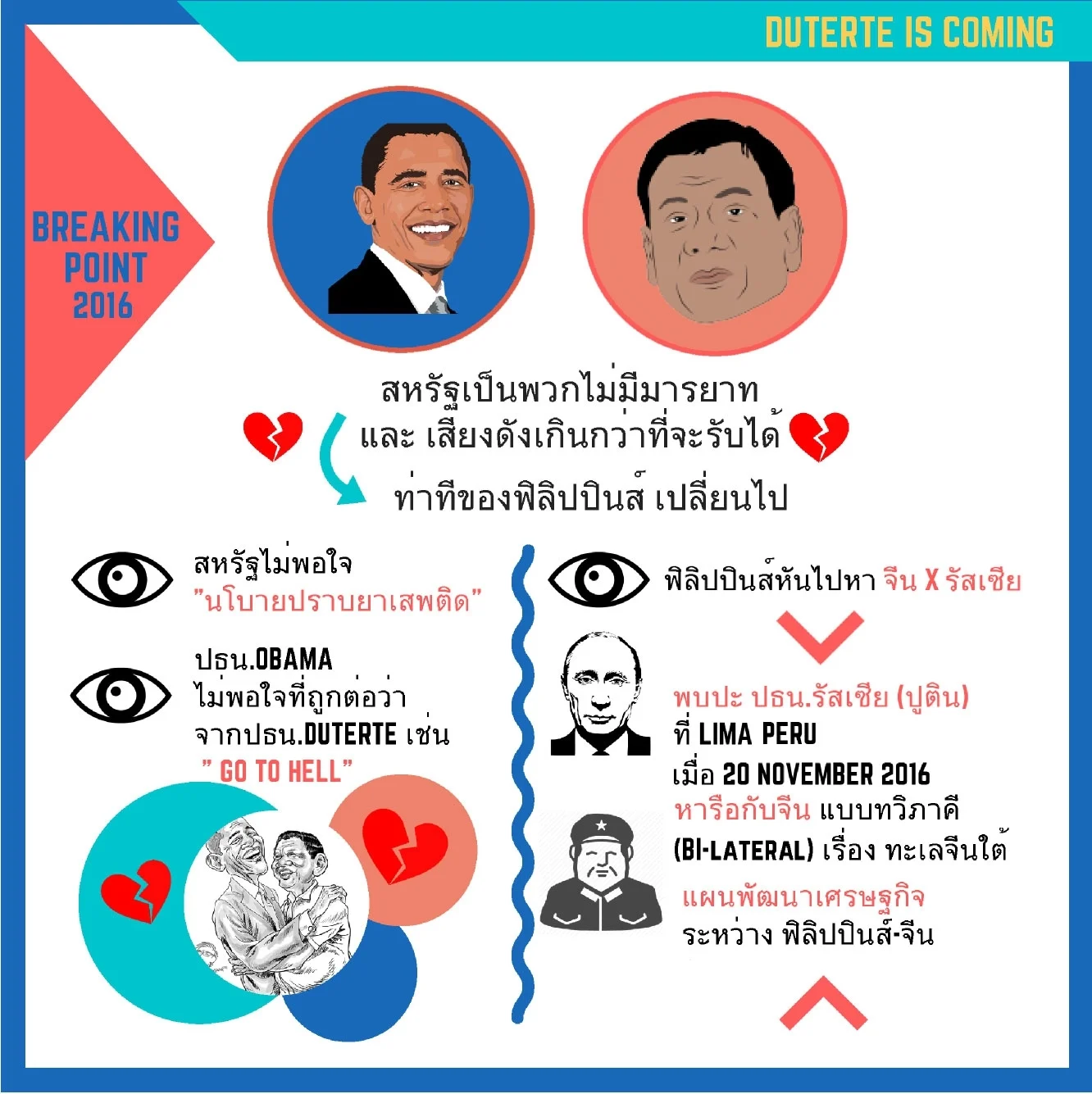 แน่นอนว่าสหรัฐอเมริการับไม่ได้กับการกระทำอันโหดร้ายของฟิลิปปินส์ ด้าน ดูเตอร์เต้ เอง ก็ไม่พอใจกับท่าทีของสหรัฐอเมริกาเช่นกัน จึงประกาศตัดความสัมพันธ์กับสหรัฐอเมริกาอย่างเป็นทางการ และหันไปผูกมิตรกับมหาอำนาจฝั่งเอเชียอย่างจีน ทั้งยังเร่งเดินหน้าวางแผนพัฒนาความร่วมมือด้านเศรษฐกิจระหว่างจีน – ฟิลิปปินส์ ที่ครอบคลุมระยะเวลา 6 ปี