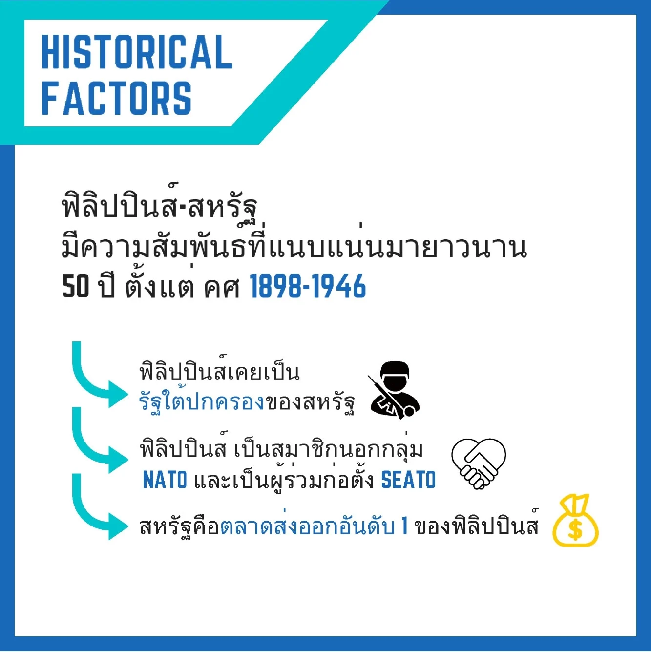ด้วยเหตุนี้ สหรัฐอเมริกา-ฟิลิปปินส์ จึงเปรียบเสมือน ‘คนรักเก่า’ ความผูกพันที่ทั้งคู่มีให้กันนั้นก็ยากที่จะตัดให้ขาดลง แต่ขณะเดียวกันก็มีตัวละครใหม่เช่น จีน เข้ามาเสนอในสิ่งที่ฟิลิปินส์ต้องการ เรื่องราวจึงซับซ้อนมากขึ้น
