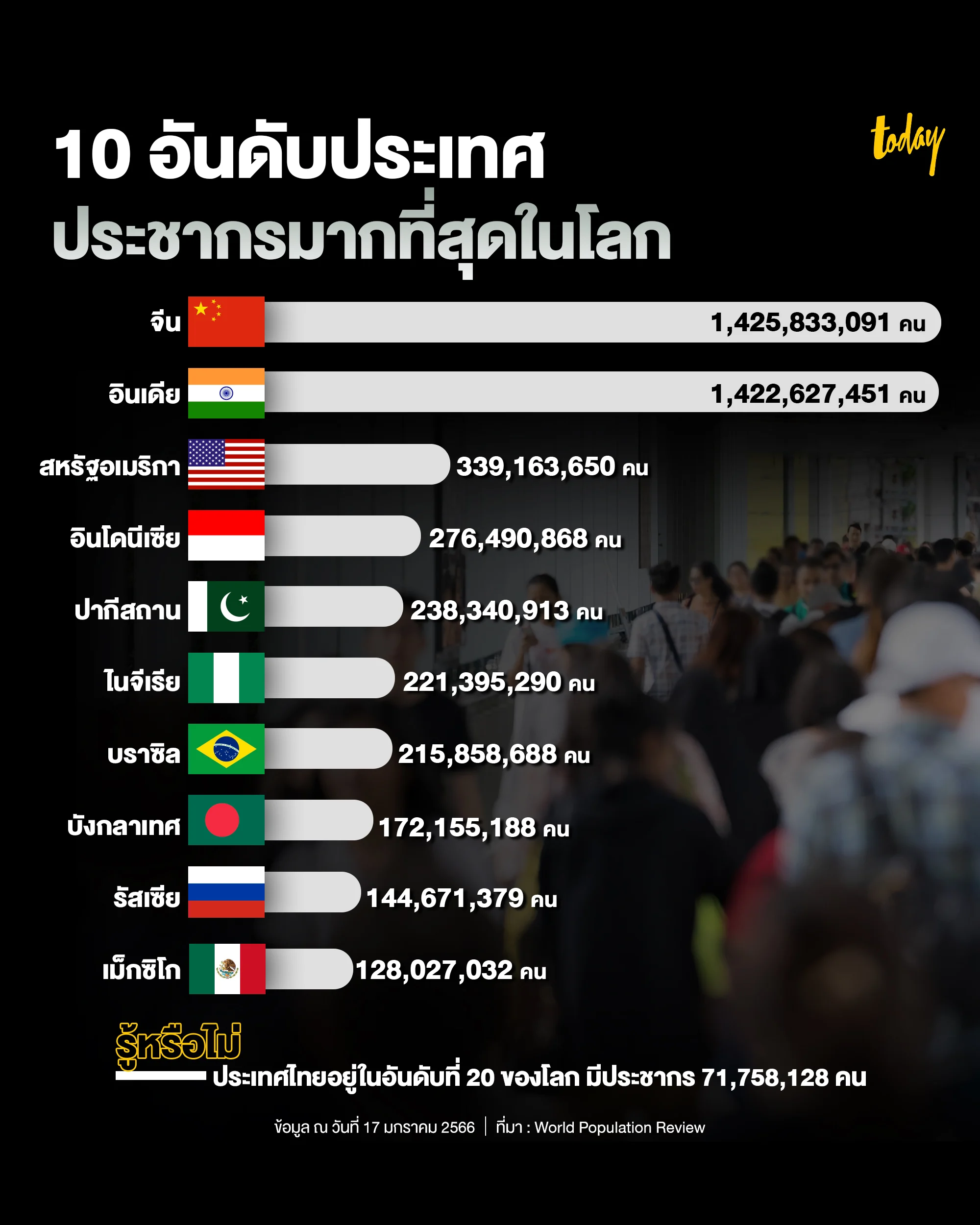 World Population Review ได้จัดอันดับ 10 ประเทศที่มีประชากรมากที่สุดในโลกขณะนี้ (ข้อมูล วันที่ 17 ม.ค.) พบว่า จีนยังคงเป็นประเทศที่มีประชากรมากที่สุดในโลก โดยมีประชากรทั้งประเทศจำนวน 1,425,833,091 คน