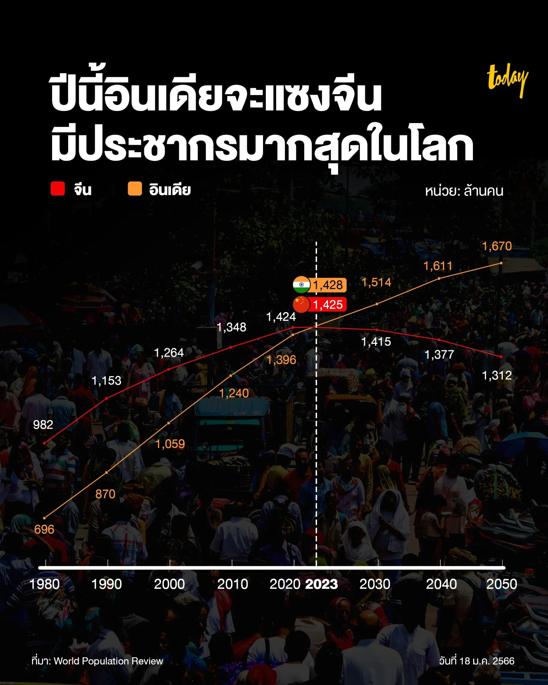 โดยข้อมูลในกราฟด้านบน ชี้ให้เห็นว่าจำนวนประชากรในอินเดีย มีแนวโน้มเพิ่มขึ้นอย่างต่อเนื่อง จากการคาดการณ์ ในปี 2023 อินเดียจะมีประชากรจำนวน 1,428 คน และจะเพิ่มขึ้นไปจนถึง 1,670 คนในปี 2050 ขณะที่จำนวนประชากรจีนเริ่มมีแนวโน้มลดลงตั้งแต่ปี 2023 เป็นต้นไป และในปี 2050 คาดว่าประชากรจีนจะเหลือเพียง 1,312 คน