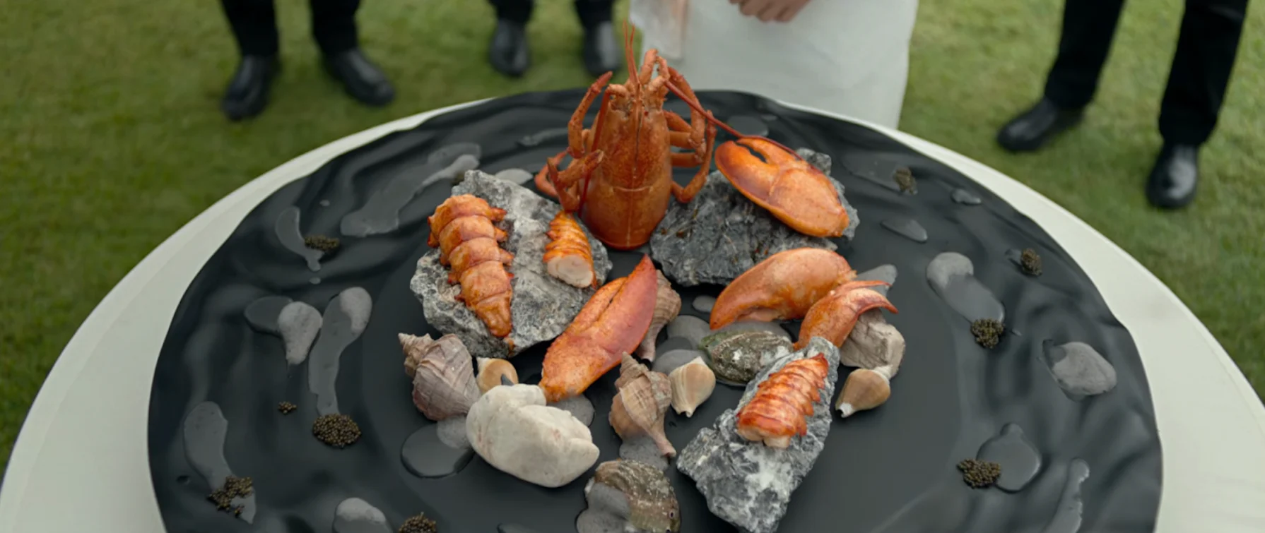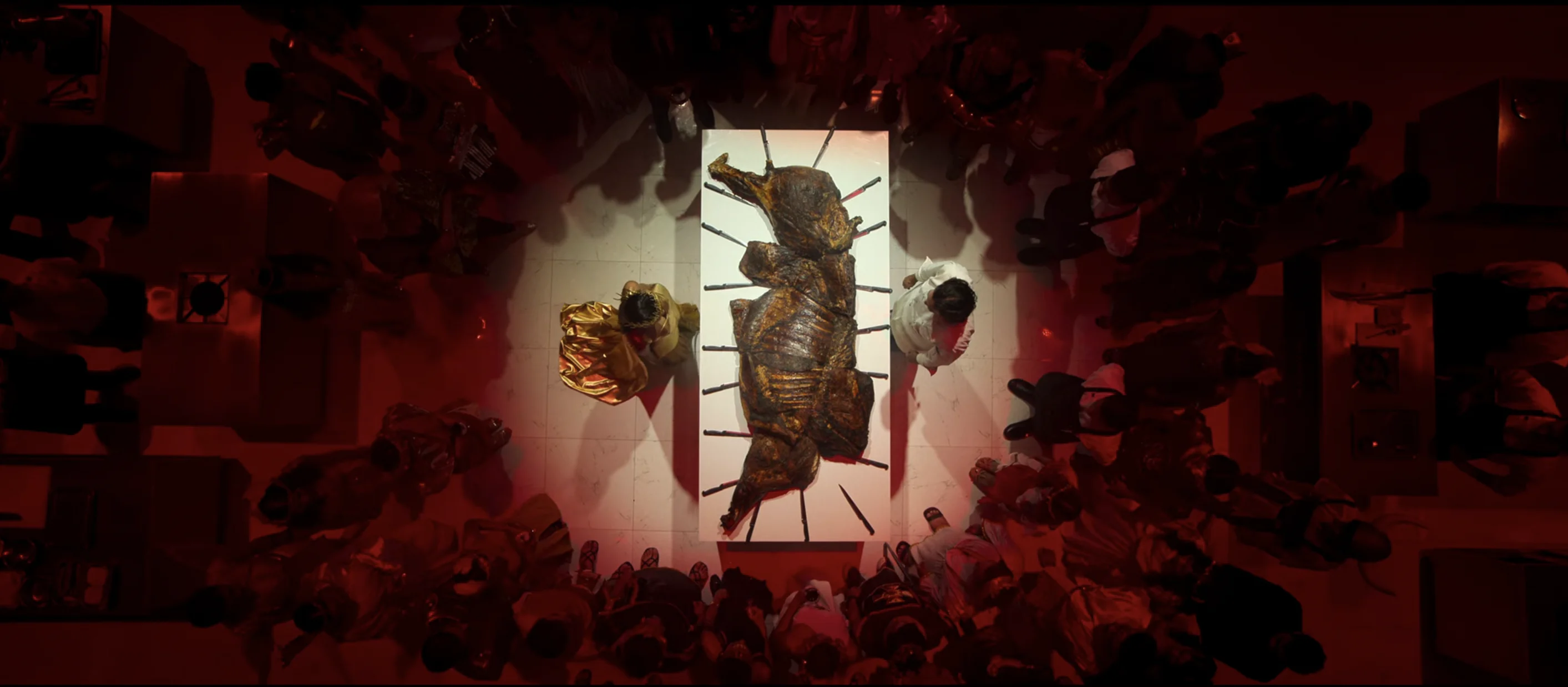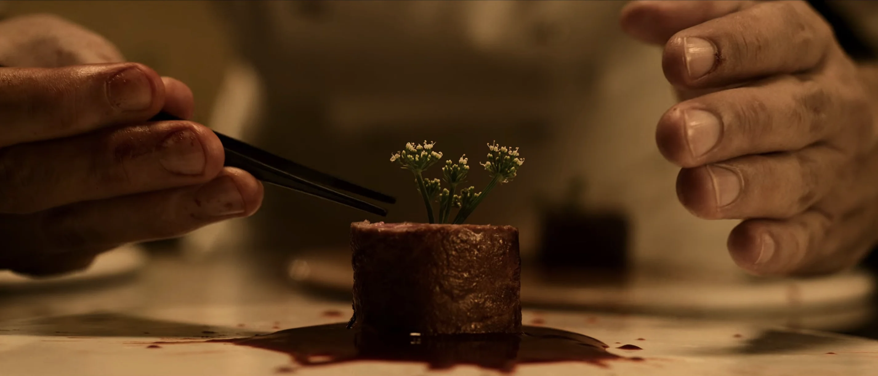 - อาหารในธีม การกินเลือดกินเนื้อ ตั้งแต่ตัวละครเจ้าของงานเลี้ยงที่มีชื่อว่าป๋าเปรมศักดิ์ ไปจนถึงอาหารที่ทำจากก้อนเนื้อม้วนซ้อนกันสนิทแน่นเป็นชั้นมีผักวางข้างบนจนดูคล้าย ‘ต้นไม้’ ที่เติบโตจาก ‘ดิน’ ที่ทำมาจากเลือดเนื้อก็ชัดเจนมากพอที่จะชวนให้คนดูคิดตามว่าอาหารจานนี้จะสื่อถึงอะไร และคนที่กินเข้าไปอย่างเปรมปรีดิ์นั้นคือคนกลุ่มไหนกัน