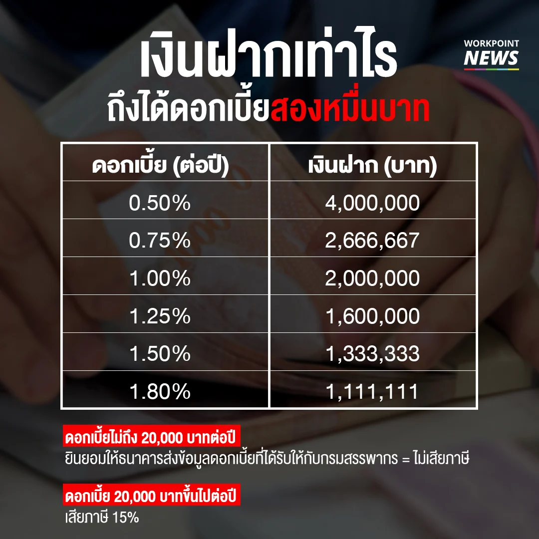 เมื่อเปรียบเทียบกับอัตราดอกเบี้ยเงินฝากออมทรัพย์ในปัจจุบันซึ่งอยู่ที่ร้อยละ 0.50 คนที่จะได้รับดอกเบี้ยมากกว่า 20,000 บาทต่อปี จะต้องมีเงินในบัญชีทุกธนาคารรวมกันมากกว่า 4,000,000 บาท