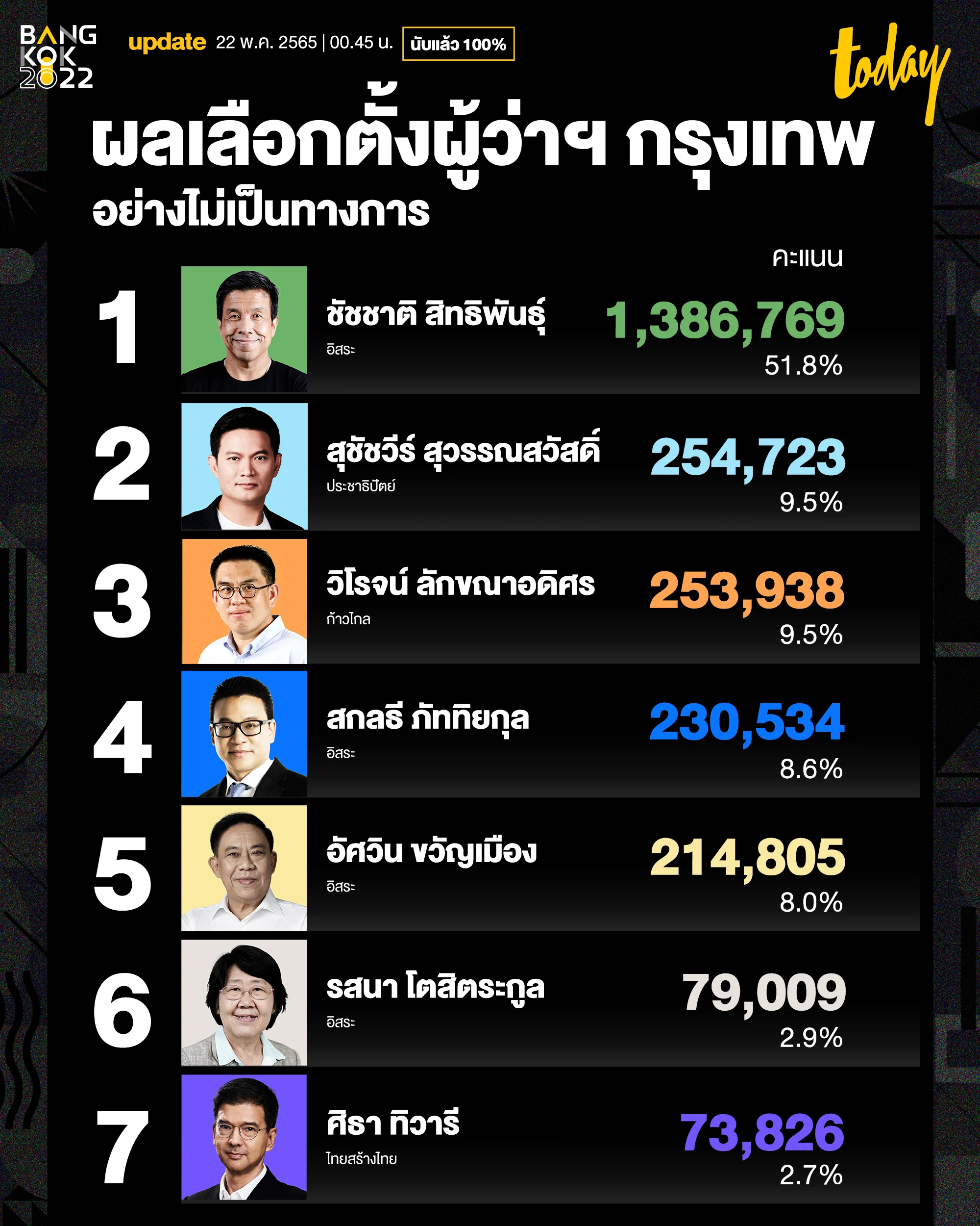 วันที่ 23 พ.ค. 2565 กกต.กรุงเทพฯ สรุปผลเลือกตั้งผู้ว่าฯกทม. และ ส.ก. อย่างไม่เป็นทางการ หลังนับคะแนนจาก 50 สำนักงานเขต รวม 6,817 หน่วยเลือกตั้งครบ 100% ในเวลา 00.45 น. ผู้ชนะการเลือกตั้งผู้ว่าฯ กทม. คือ หมายเลข 8 นายชัชชาติ สิทธิพันธุ์ ผู้สมัครอิสระ ได้คะแนนเลือกตั้งสูงสุด 1,386,215 คะแนน สรุปรายละเอียดได้ดังนี้