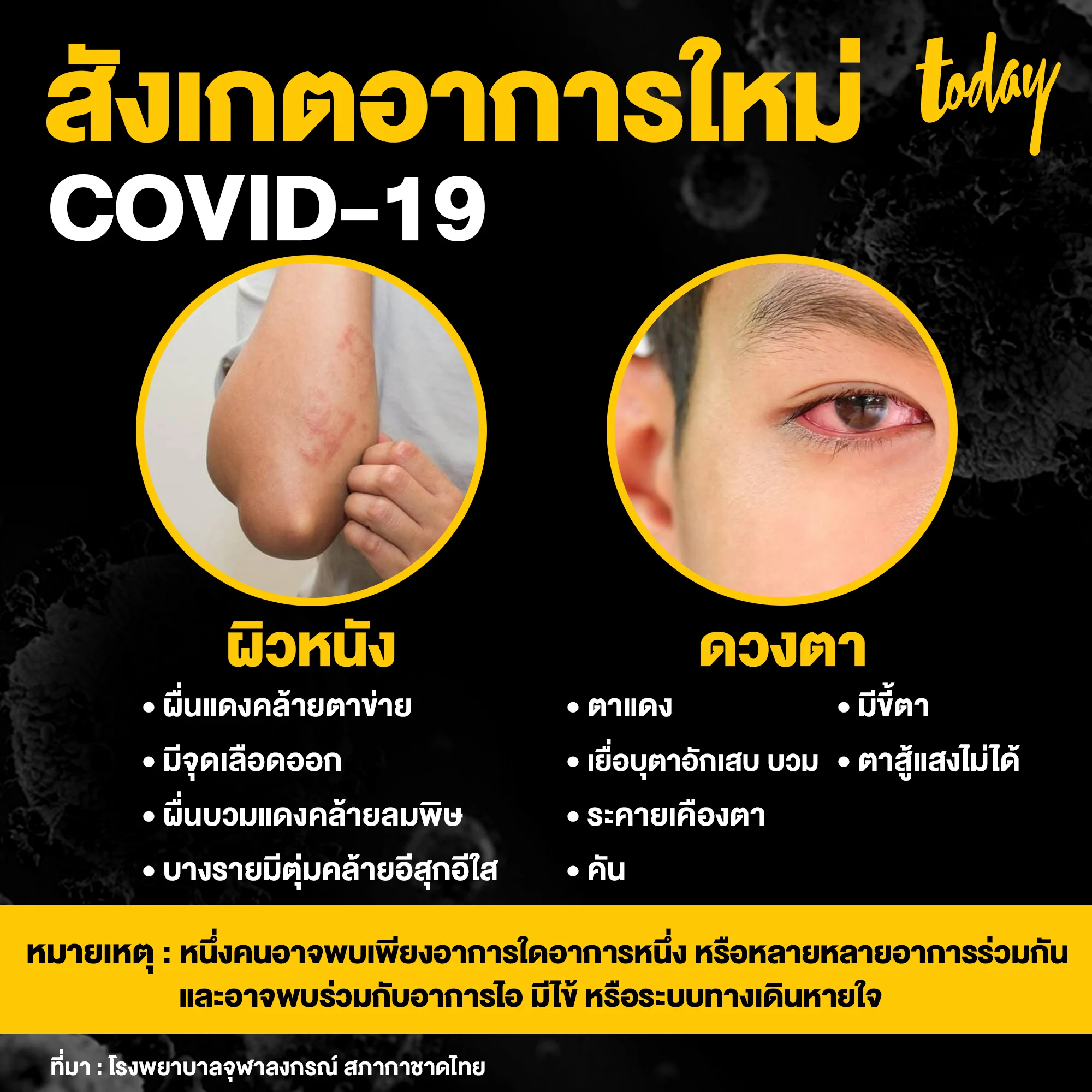 การระบาดระลอกใหม่ของโควิด-19 ในไทย จากสถานบันเทิง พบว่า ส่วนใหญ่เป็นคนวัยหนุ่มสาวที่แสดงอาการน้อยมาก โดย นพ.โอภาส การย์กวินพงศ์ อธิบดีกรมควบคุมโรค กระทรวงสาธารณสุข ออกมาเปิดก่อนหน้านี้ว่า จากการสังเกตอาการทางคลินิกของผู้ป่วยโควิด-19 มีอาการใหม่เพิ่มเติม คือ ตาแดง น้ำมูกไหล ไม่มีไข้ บางรายมีผื่น ต่างจากอาการเดิม คือ มีไข้ ไอ เจ็บคอ จมูกไม่ได้กลิ่น ลิ้นไม่รับรส ซึ่งทำให้หลายคนเริ่มเกิดความกังวลเนื่องจากเป็นอาการที่ใกล้เคียงกับโรคภูมิแพ้และการติดเชื้อไวรัสชนิดอื่น โดยข้อมูลทางการแพทย์จากโรงพยาบาลจุฬาลงกรณ์ สภากาชาดไทย เกี่ยวกับลักษณะอาการโควิด-19 ทั้งทางผิวหนังและดวงตา ดังนี้