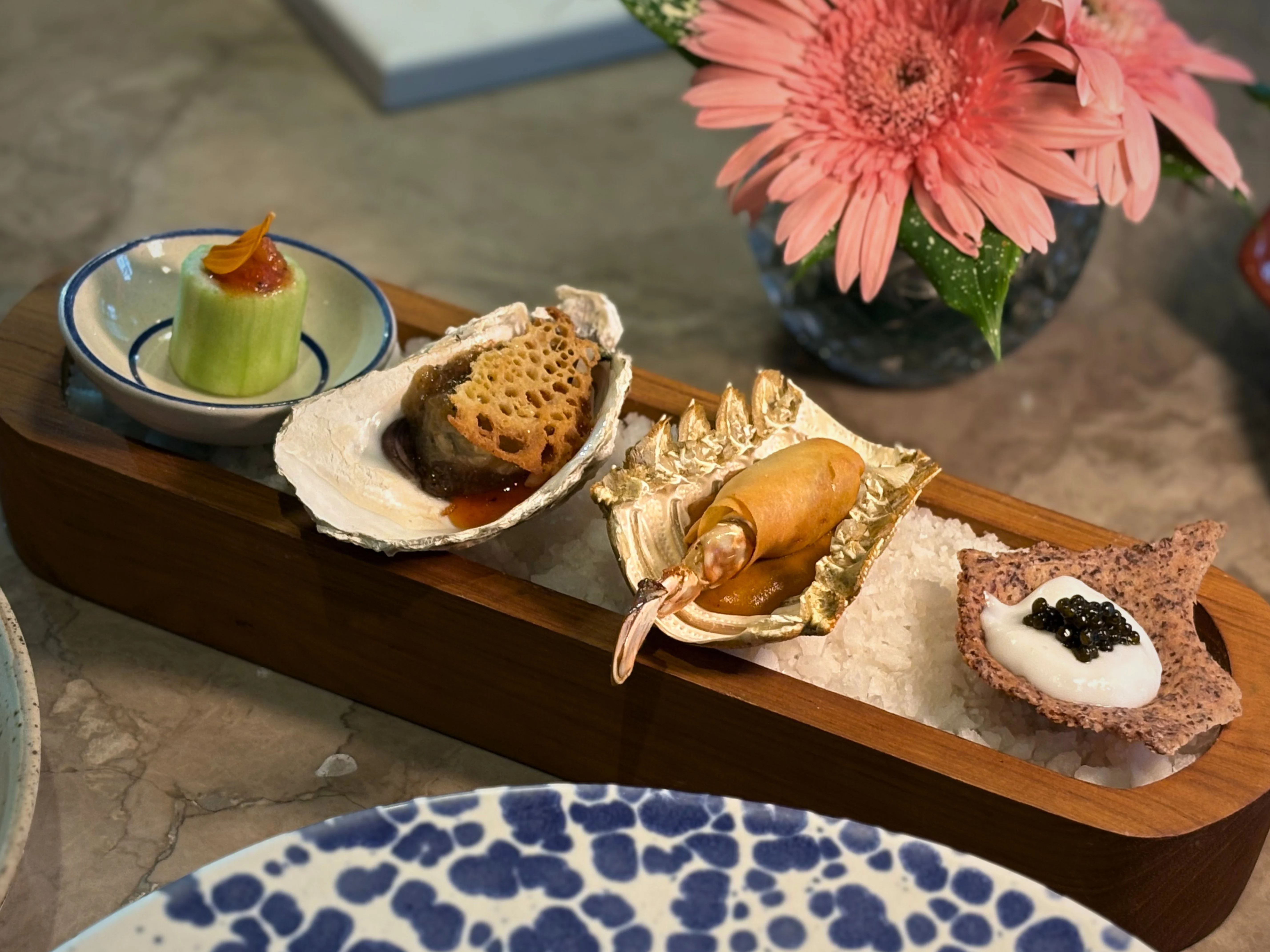 เริ่มต้นการเดินทางด้วย Amuse Bouche 4 คำที่ประกอบไปด้วย ‘ขนมครกคาเวียร์’ ขนมครกหอมมันที่เราคุ้นเคยแต่โรยหน้าด้วยคาเวียร์ของดีจากหัวหิน ‘ส้ามะเขือเทศ’ รสชาติสดชื่นจากเชฟชุมพล ‘เปาะเปี๊ยแกงกะหรี่หัวหิน’ ที่มีปูแบบเต็มคำเนื้อหวานๆ เข้ากับแกงกะหรี่เผ็ดหอมเครื่องเทศไม่เหมือนใคร และ ‘หอยนางรมหัวหินทอดกรอบ’ เป็นสี่คำที่ให้รสสัมผัสสนุกสนานถูกใจคนชอบของกรอบ