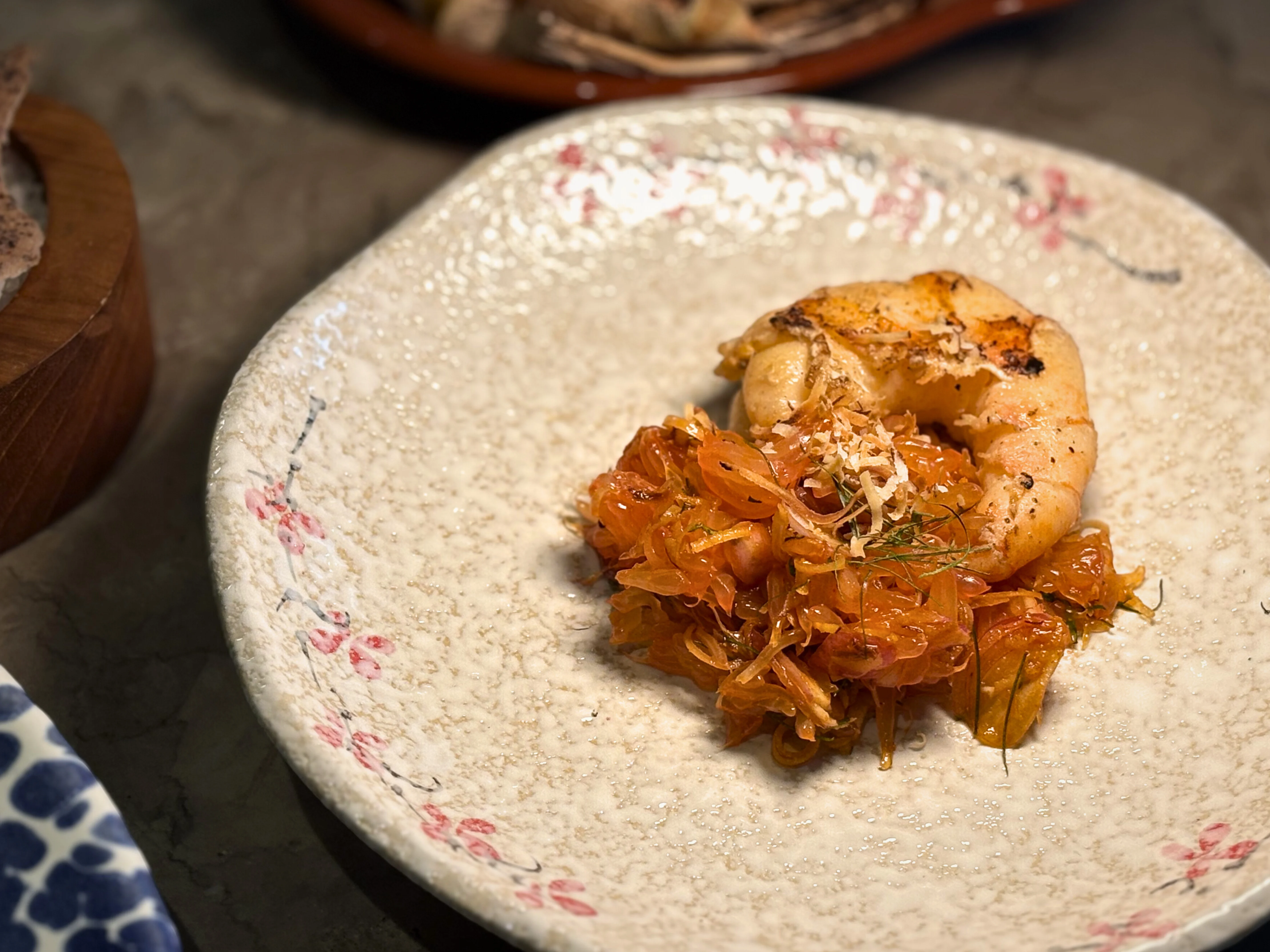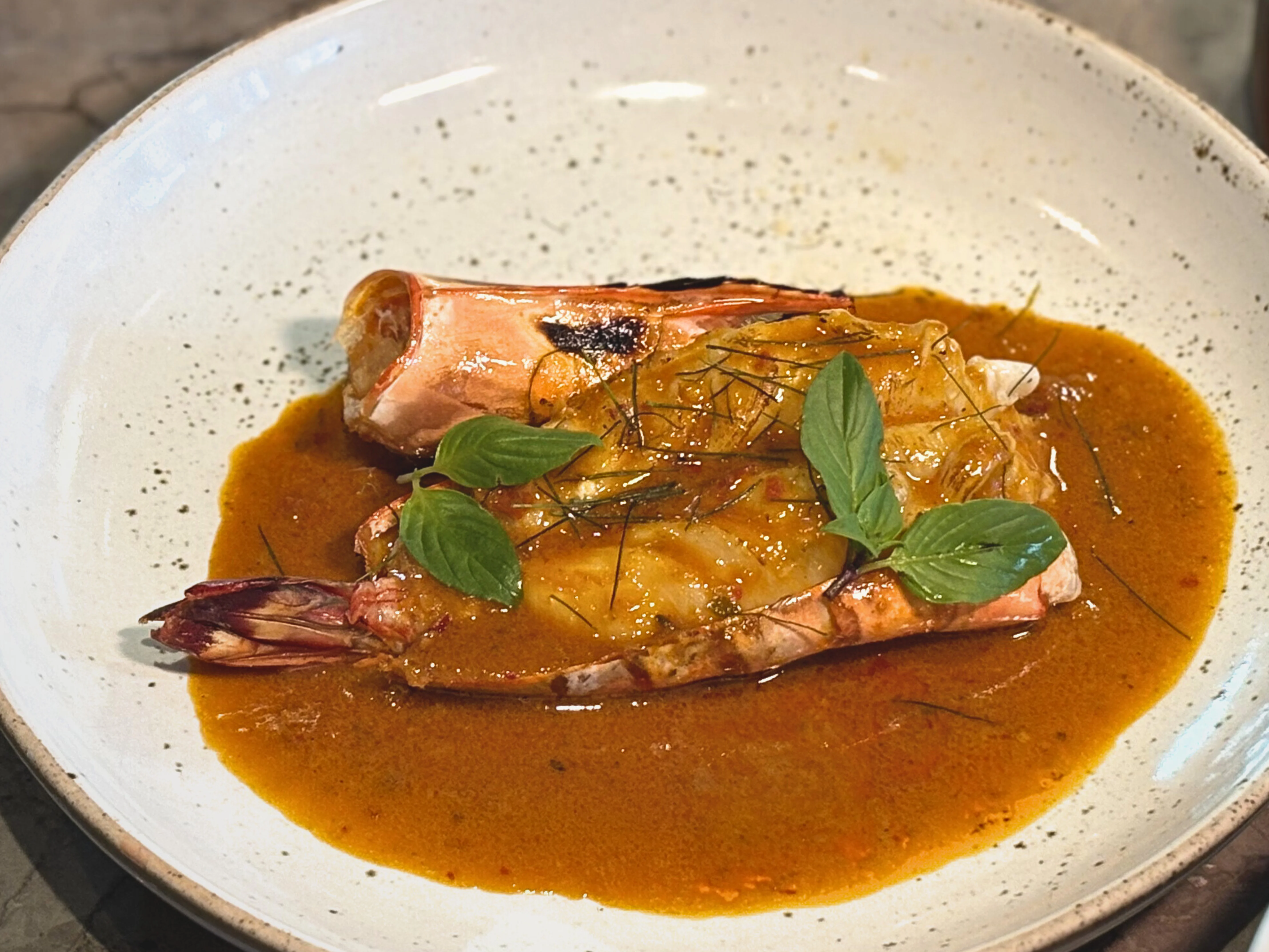 หรือ ‘กุ้งลายเสือรมควันเนื้อมะพร้าวหอมรากซอสฉู่ฉี่สมุนไพร’ จากเชฟอิษฏ์ กุ้งตัวโตๆ นุ่ม เด้ง หวาน เข้ากับซอสฉู่ฉี่สุดเข้มข้นรับประทานกับข้าวสวยร้อนๆ