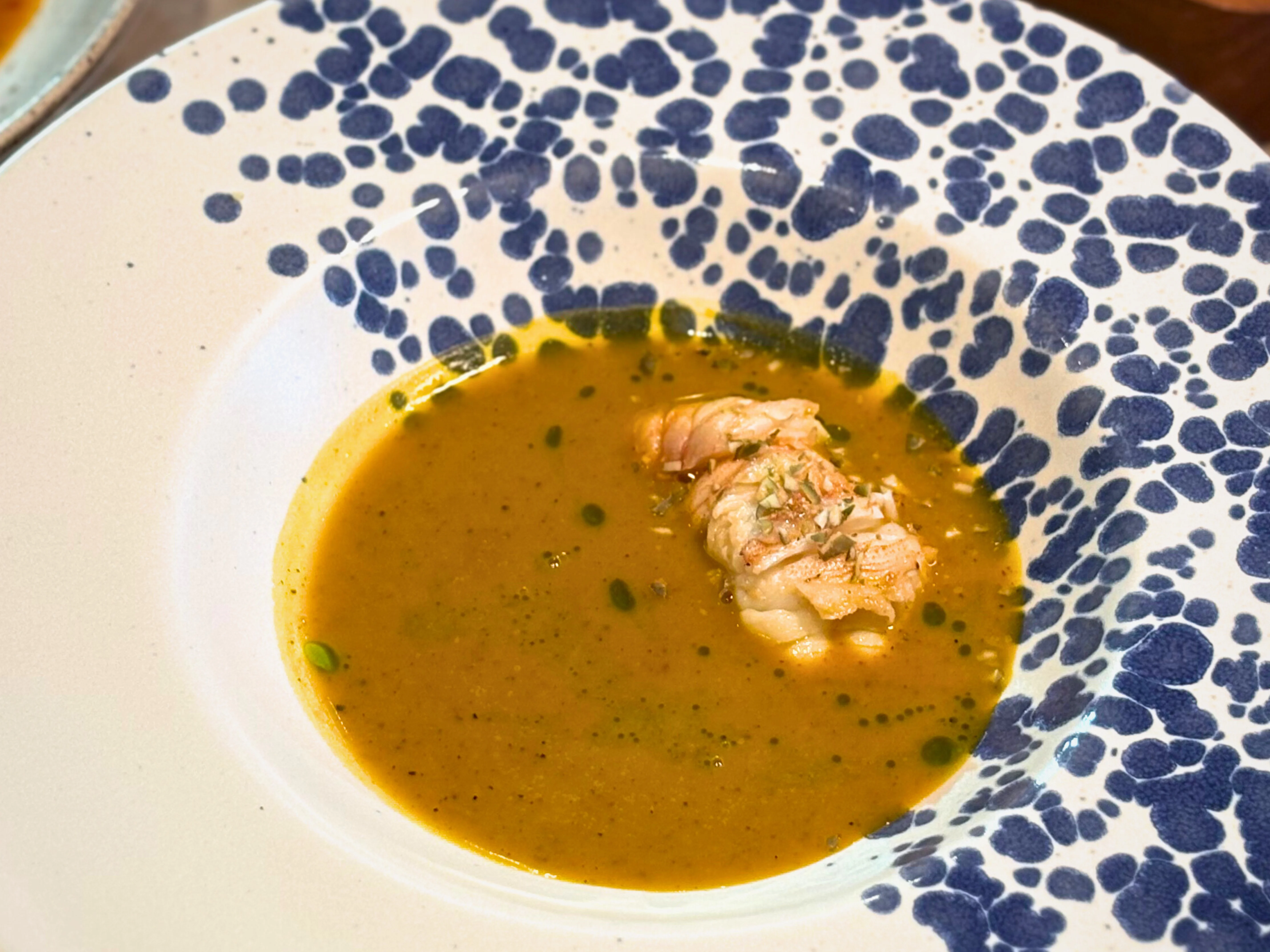 มาถึงจานซุปอย่าง ‘แกงเลียงฟักทองเผาเคล้าคลอกั้งหัวหินย่างถ่าน’ ซุปฟักทองกับกั้งย่างหอมถ่านและเครื่องเทศ ซดได้เรื่อยๆ เพลินใจ
