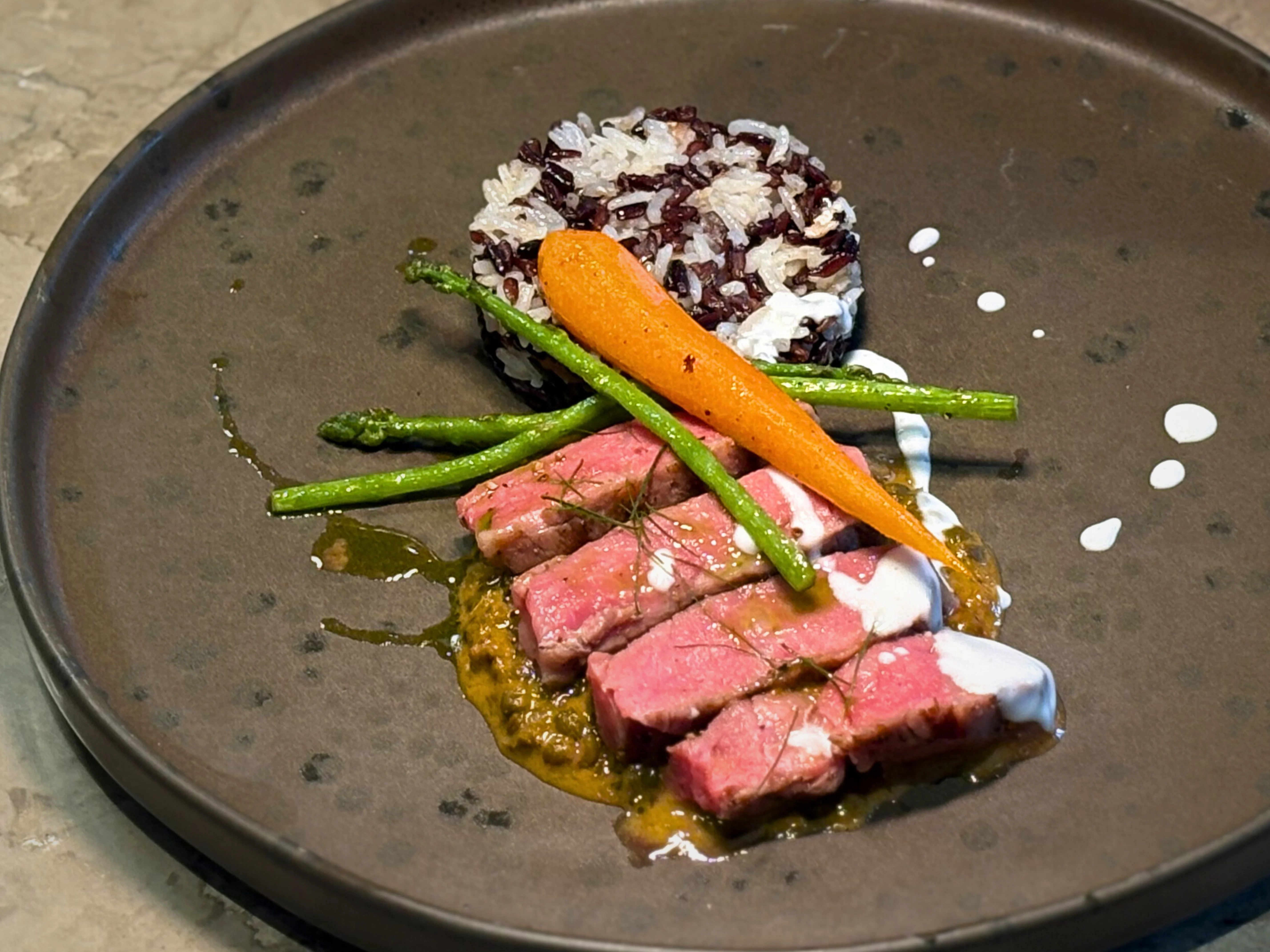 จานหลักในธีม ‘A Duet of Curries’ มีให้สองทางเลือก ระหว่าง ‘แกงขี้เหล็กโบราณเนื้อโคขุนกำแพงแสนย่างดอกเกลือเมืองเพชร’ จากเชฟชุมพล เนื้อโคขุนนุ่มย่างจนเนื้อสุกแดงกำลังดีเข้ากับแกงขี้เหล็กที่กลิ่นเครื่องเทศชัดเจน