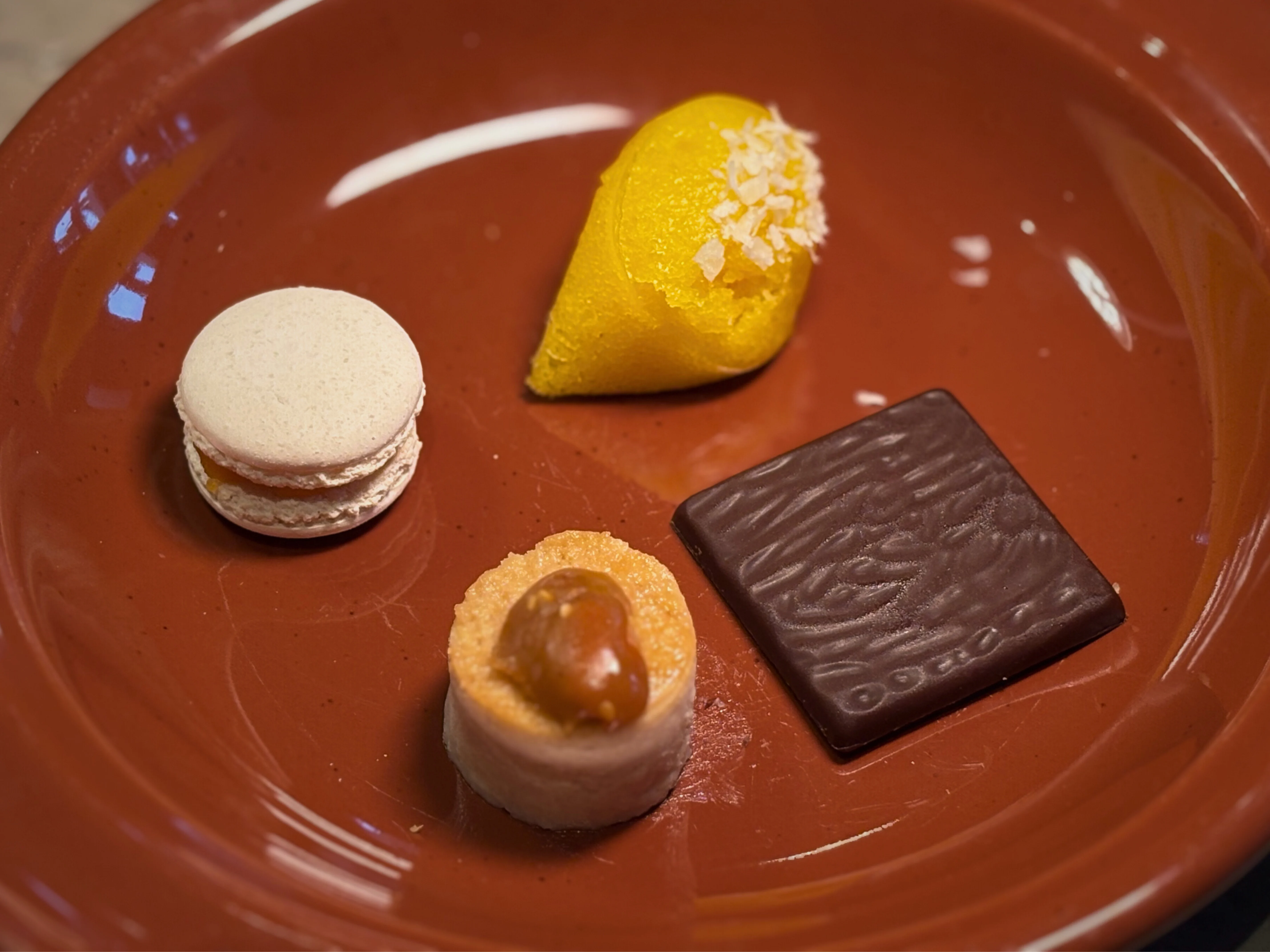 ปิดท้ายด้วย Petit Four สี่คำเล็กที่ทำให้เรากลับห้องอย่างอิ่มใจ ด้วย ‘ขนมตาลสดเมืองเพชร โกโก้ชุมพรแสงสะท้อนนาเกลือสมุทร ถั่วตัดเม็ดมะม่วงคาราเมล และ มาการองหอมหวานไข่เค็มออร์แกนิก’
