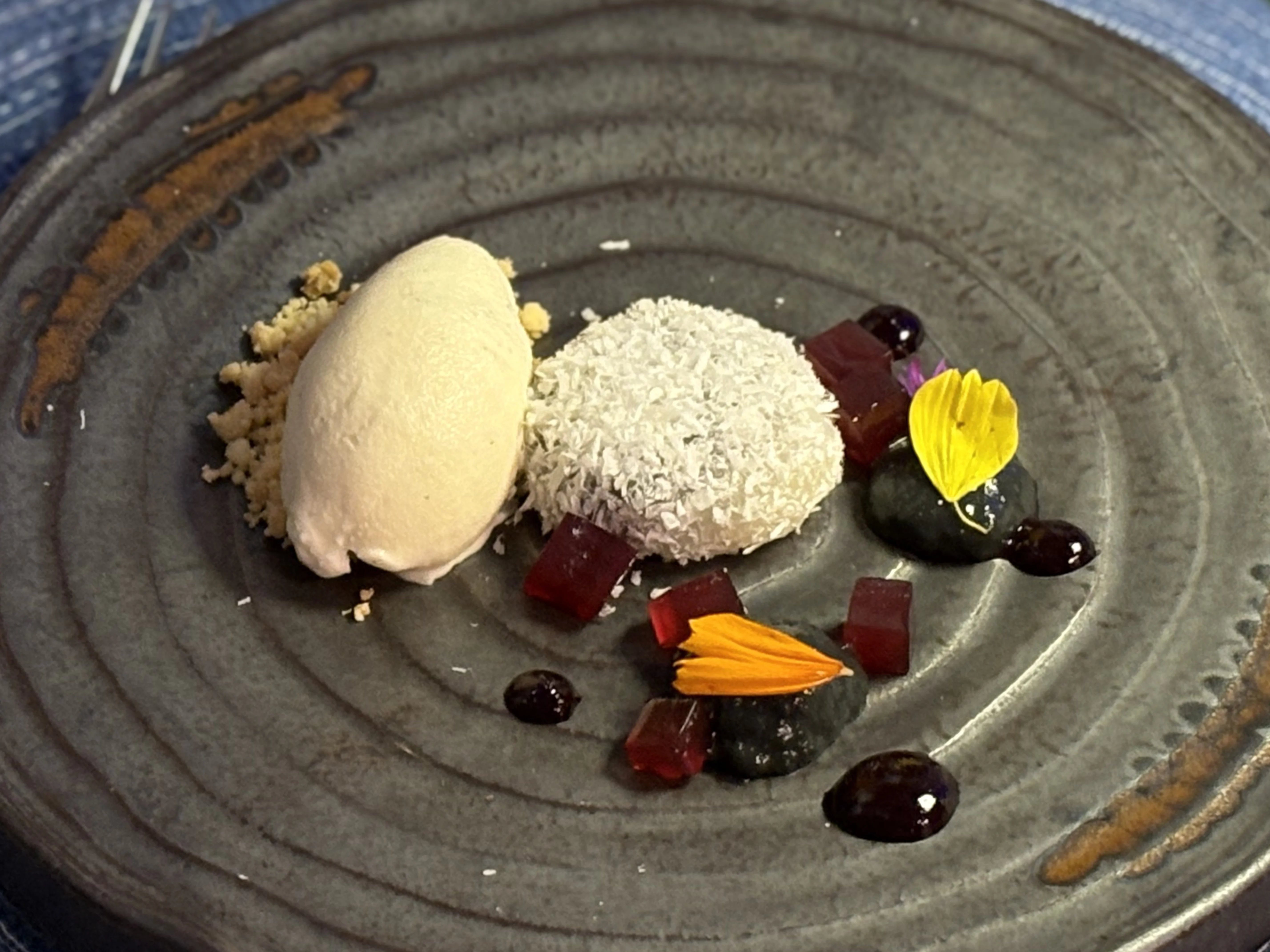 อิ่มจานคาวแล้วมาล้างปากด้วยของหวานอย่าง ‘เปียกปูนอ่อนเคียงเจลลี่และซอสไวน์มอนซูน วัลเล่ย์ เข้าคู่กับขนมโคอบร่ำกลิ่นมะลิไส้มะพร้าวน้ำตาลปึกออร์แกนิกปราณบุรี และถั่วกับไอศกรีมวานิลา’ หอม มัน หวาน เปรี้ยว ครบในจานเดียว