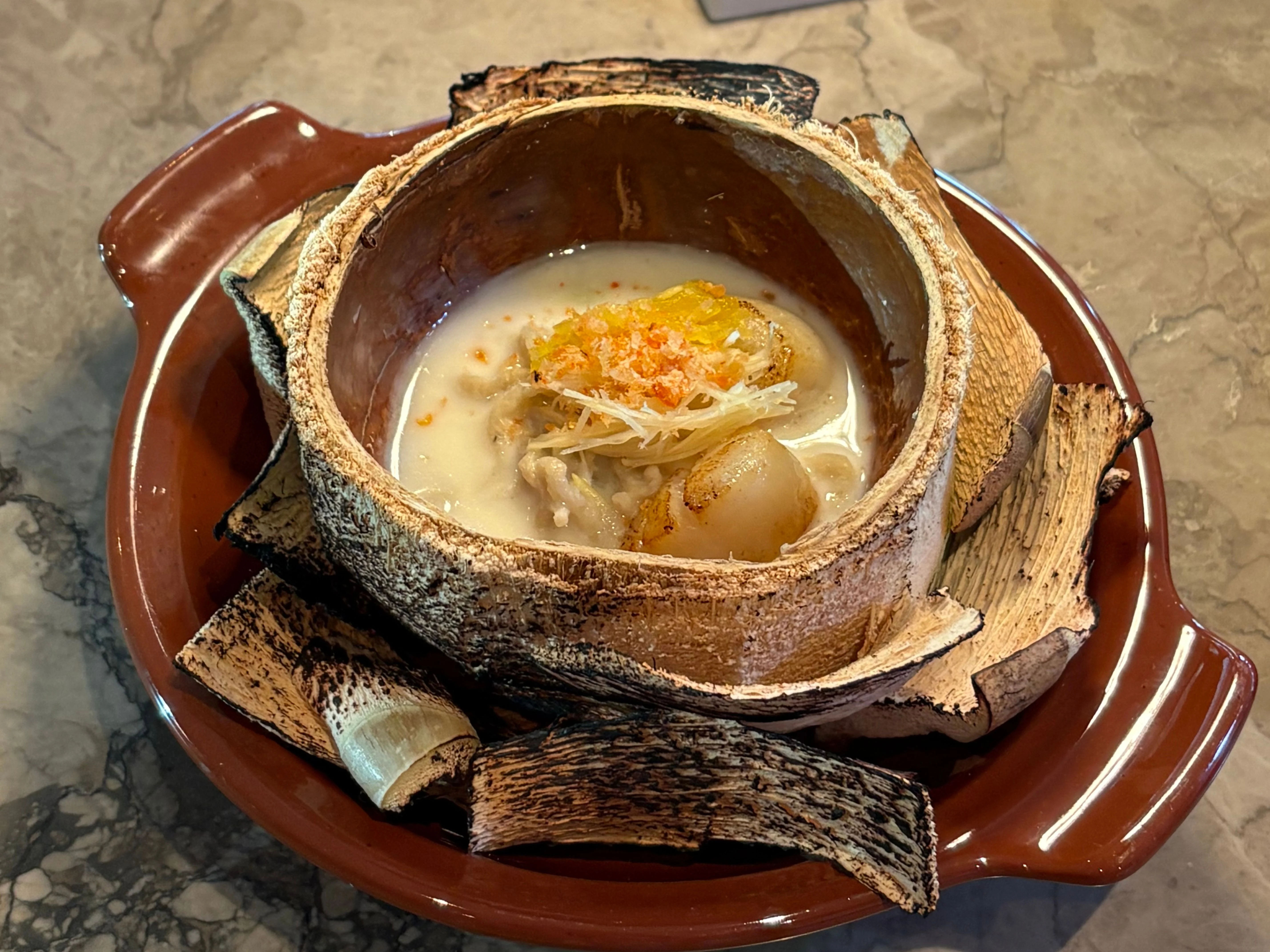ตามมาด้วยจานที่จับคู่วัตถุดิบที่หลายคนจะคิดถึงเมื่อมาหัวหินคือ สัปปะรดและหอยเชลล์ กับ ‘เส้นปลาเก๋าซาวน้ำสัปปะรดหัวหินและหอยเชลล์อบฟาง’ ที่เสิร์ฟมาในลูกมะพร้าว เส้นปลาที่นุ่มนวลเข้ากันได้ดีกับความสดชื่นของสัปปะรดได้เป็นอย่างดี