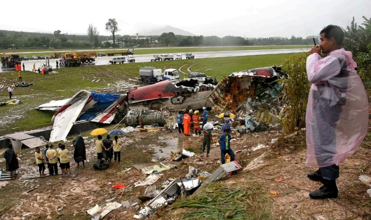 ภาพเหตุการณ์เครื่องบินโดยสารสายการบิน วัน-ทู-โก เที่ยวบิน โอจี 269 เกิดอุบัติเหตุลื่นไถลออกนอกรันเวย์ที่สนามบินภูเก็ต เมื่อวันที่ 16 ก.ย.2550 ส่งผลให้มีผู้เสียชีวิต 90 ราย ผู้โดยสาร 2 ใน 3 เป็นนักท่องเที่ยวชาวต่างชาติ