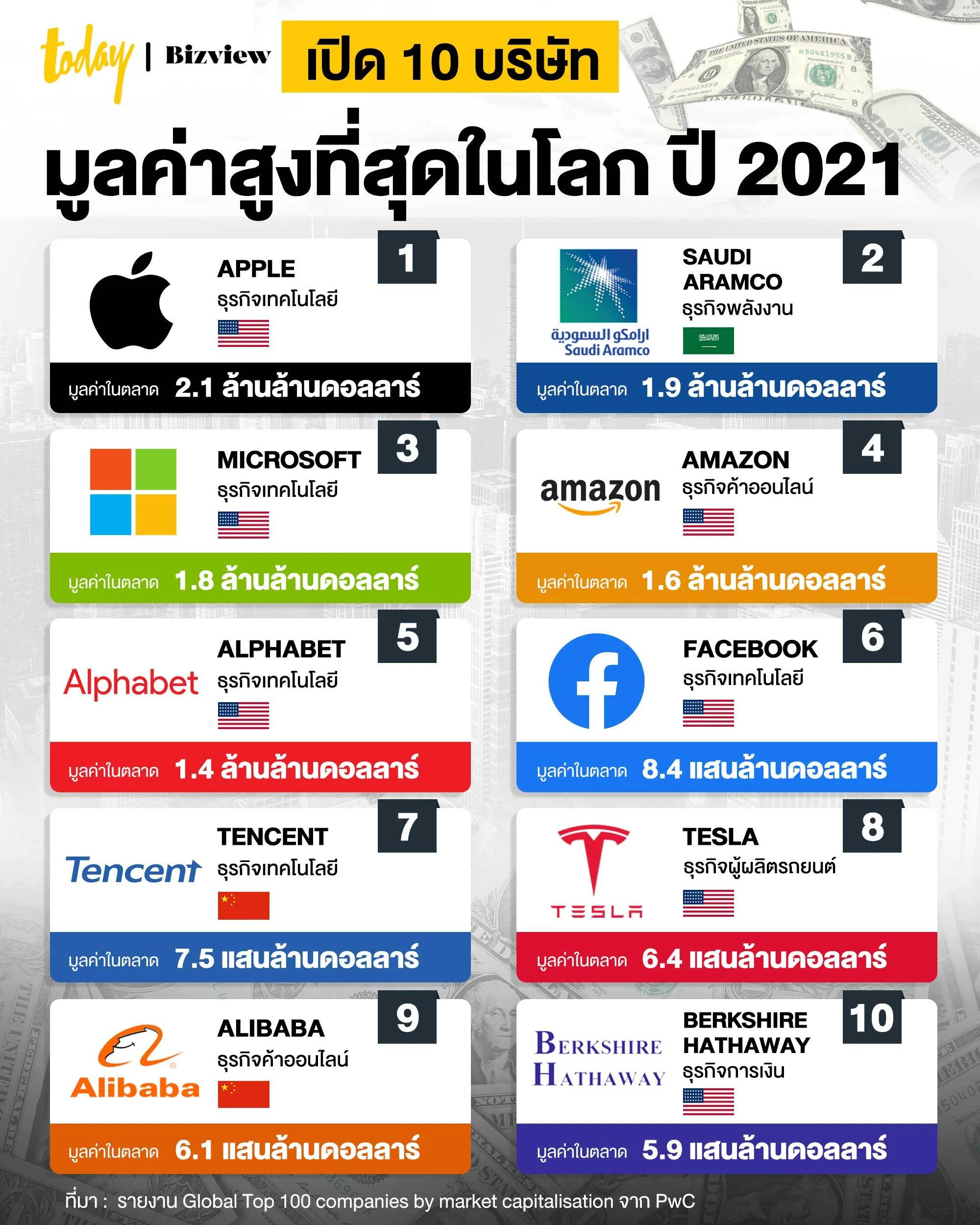 สำรวจ 10 บริษัทที่มีมูลค่ามากที่สุดในโลกจากการรายงานของ PwC บริษัทตรวจสอบบัญชีระดับโลก