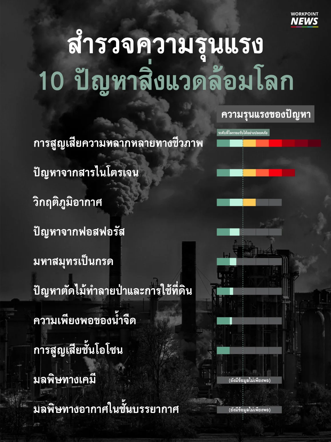 ส่วนสองปัญหาสุดท้าย คือมลพิษทางเคมี และปัญหามลพิษในชั้นบรรยากาศนั้น ยังไม่มีการเก็บข้อมูลที่ดีและมากพอที่จะบอกได้ว่าความรุนแรงของปัญหาอยู่ในระดับใด