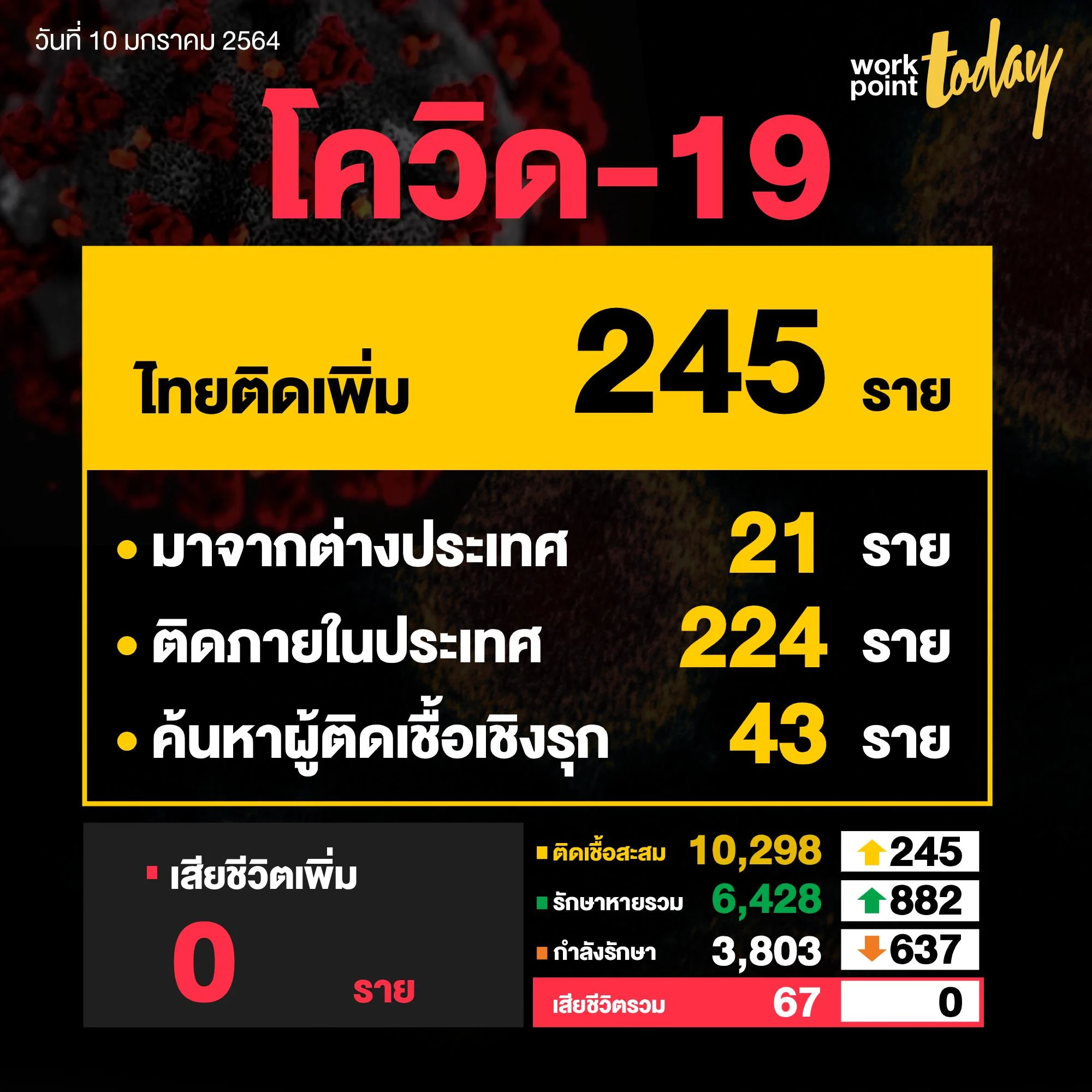 วันที่ 10 ม.ค.2564 นพ.ทวีศิลป์ วิษณุโยธิน โฆษกศูนย์บริหารสถานการณ์การแพร่ระบาดของโรคติดเชื้อไวรัสโคโรนา 2019 (โควิด-19) หรือ ศบค. รายงานสถานการณ์การแพร่ระบาดของเชื้อไวรัสโควิด-19 ประจำวันว่า มีผู้ป่วยรายใหม่เพิ่มขึ้น 245 ราย เป็นผู้ติดเชื้อภายในประเทศ 181 ราย เป็นผู้ที่เดินทางมาจากต่างประเทศ และเข้า State Quarantine 21 ราย ทำให้มีผู้ป่วยยืนยันสะสม 10,298 ราย หายป่วยแล้ว 6,428 ราย เพิ่มขึ้น 882 ราย และไม่มีผู้เสียชีวิตเพิ่มเติม ทำให้ยอดผู้เสียชีวิตสะสมอยู่ที่ 67 ราย มีผู้ติดเชื้อยังกระจายอยู่ใน 58 จังหวัด