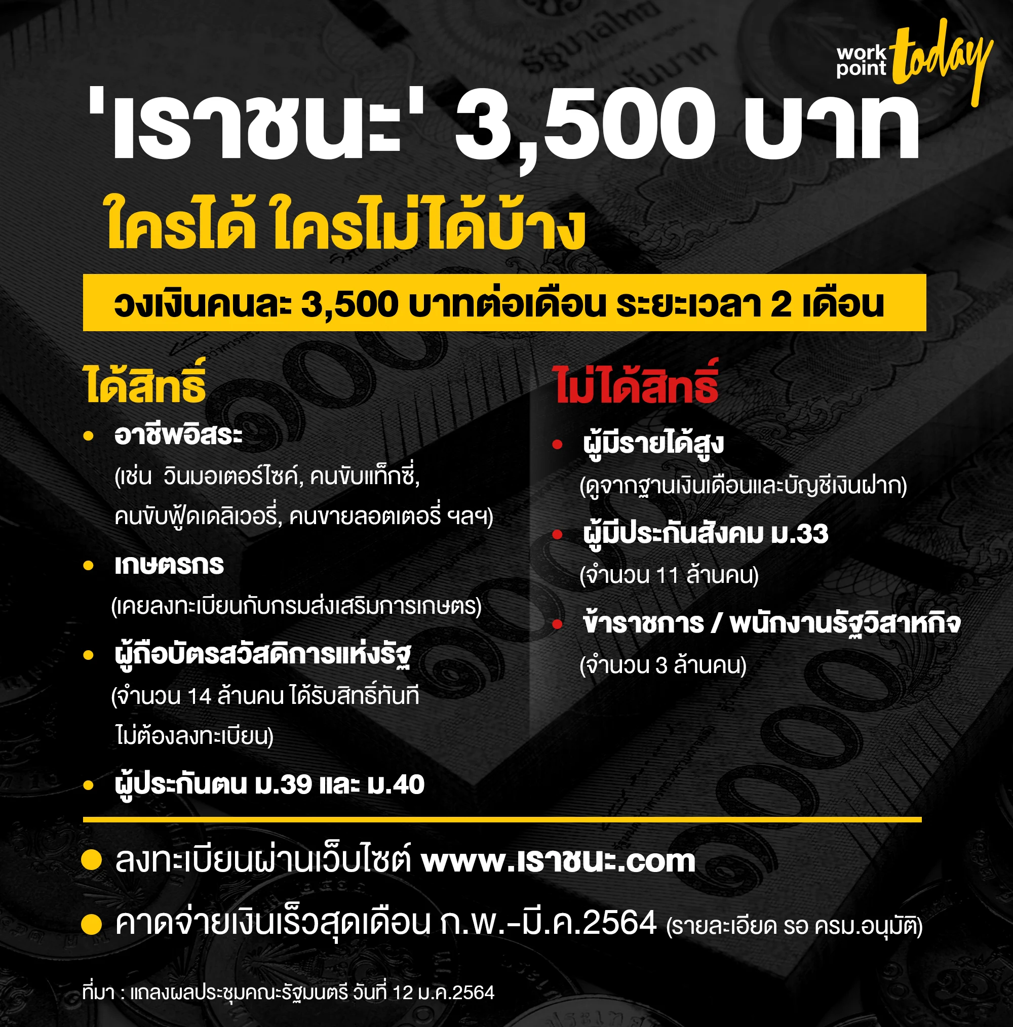 ที่ประชุมคณะรัฐมนตรีเมื่อวันที่ 12 ม.ค.ที่ผ่านมามีมติโครงการเราชนะ 1 ในมาตรการเยียวยาผู้ได้รับผลกระทบจากการระบาดโควิด-19 ระลอกใหม่ เป็นโครงการที่จะจ่ายเงินช่วยเหลือประชาชนคนละ 3,500 บาทต่อเดือน รวมระยะเวลา 2 เดือน
