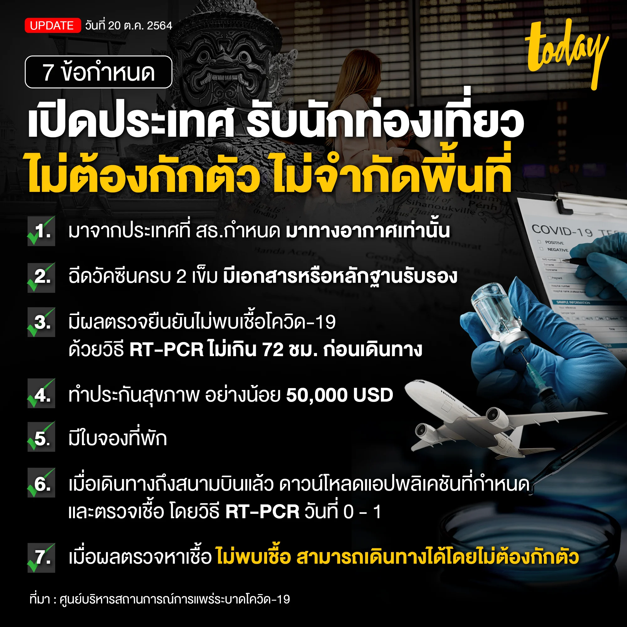 2. กลุ่มที่เข้าพื้นที่นำร่องท่องเที่ยว หรือ Sandbox เช่น สมุย พังงา กระบี่ ตามเงื่อนไขที่กำหนดคือ วัคซีนครบ ไม่จำกัดประเทศ ใช้หลักการเดียวกับกลุ่มที่ 1 คือได้รับวัคซีนครบ 2 เข็ม มีการตรวจหาเชื้อดควิด 72 ชั่วดมงก่อนการเดินทาง มีประกันสุขภาพ และหลักฐานการจองที่พัก มีการตรวจโควิดซ้ำในวันที่ 6 หรือ 7 ก่อนที่จะออกจากแซนด์บ็อกซ์นั้น