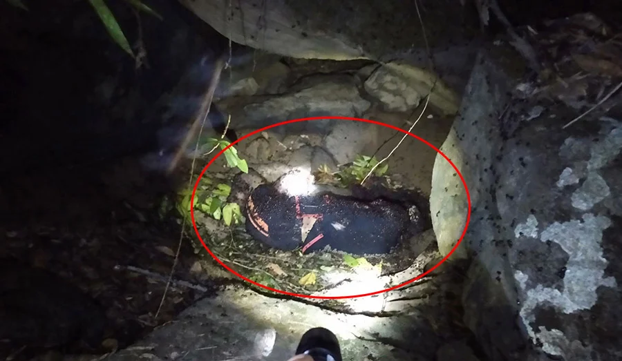 ทั้งนี้ สืบเนื่องมาจากชุดปฏิบัติการค้นหาได้รับแจ้งจากชาวบ้าน เมื่อเวลา 19.00 น.หลังเข้าไปเก็บเห็ดในป่าบ้านนาสนวน ได้พบศพชายไทยไม่ทราบชื่อเสียชีวิตอยู่สภาพนั่งเอียงพิงอยู่บนก้อนหิน คาดเสียชีวิตมาแล้ว 3 วัน สภาพศพยังใส่ผ้าฝ้ายเสื้อดำ คาดแถบสีแดง ชุดเดิมก่อนหายไป