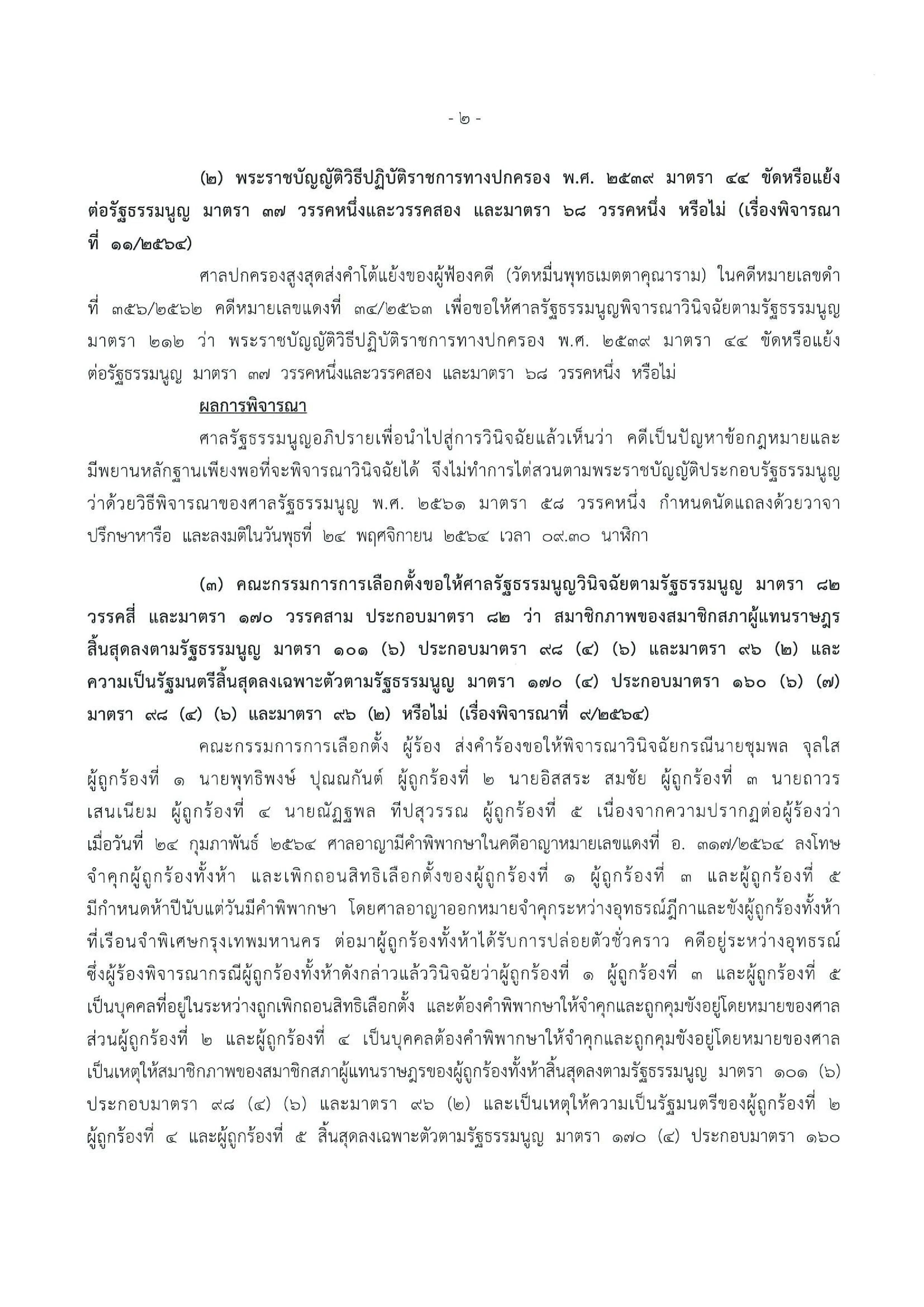 โดย นายวิรุฬ แสงเทียน ตุลาศาลรัฐธรรมนูญ เป็นผู้อ่านคำวินิจฉัย ว่า ข้อเท็จจริงตามคำร้องคำชี้แจงข้อกล่าวหา คำชี้แจงที่เกี่ยวข้องและเอกสารประกอบ ปรากฏว่า ผู้ถูกร้องเป็น หัวหน้าพรรคประชาชนปฏิรูป ภายหลังการเลือกตั้งทั่วไป ผู้ถูกร้อง เป็นสมาชิกสภาผู้แทนราษฎร แบบบัญชีรายชื่อ สังกัดพรรคประชาชนปฏิรูป