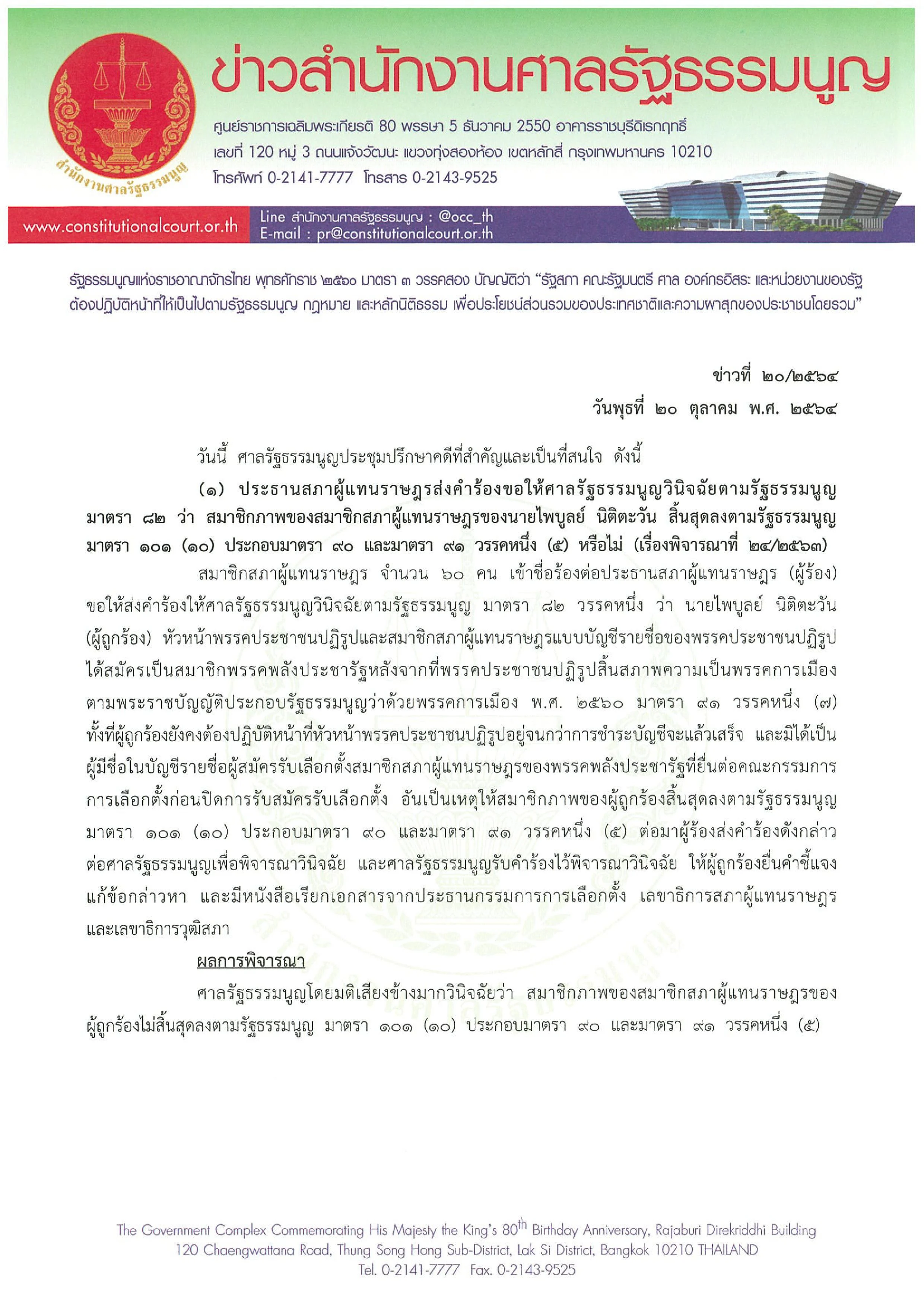 วันที่ 20 ต.ค. 2564 เวลา 15.22 น. ศาลรัฐธรรมนูญออกนั่งพิจารณาเพื่ออ่าน คำวินิจฉัย เรื่อง ประธานสภาผู้แทนราษฎร ส่งคำร้องขอให้ศาลรัฐธรรมนูญวินิจฉัยตามรัฐธรรมนูญ มาตรา 82 ว่า สมาชิกภาพของ สมาชิกสภาผู้แทนราษฎร ของนายไพบูลย์ นิติตะวัน สิ้นสุดลงตามรัฐธรรมนูญมาตรา 101 (10) ประกอบมาตรา 90 และมาตรา 91 วรรคหนึ่ง (5) หรือไม่