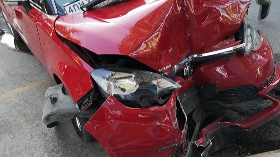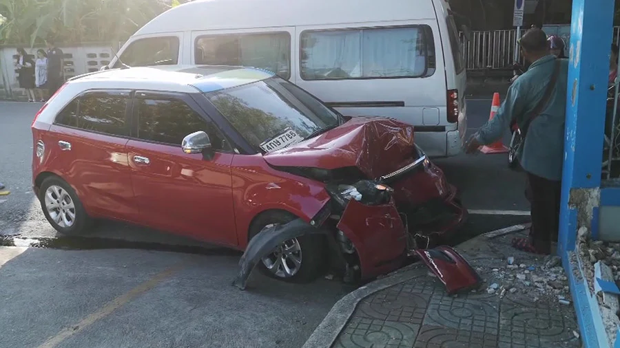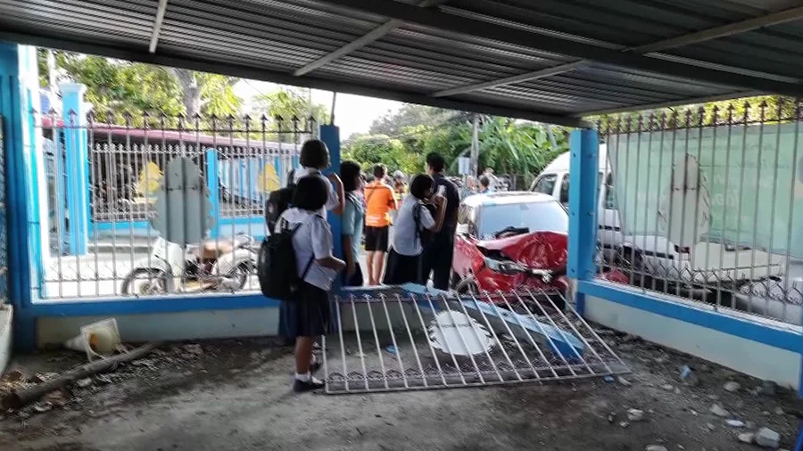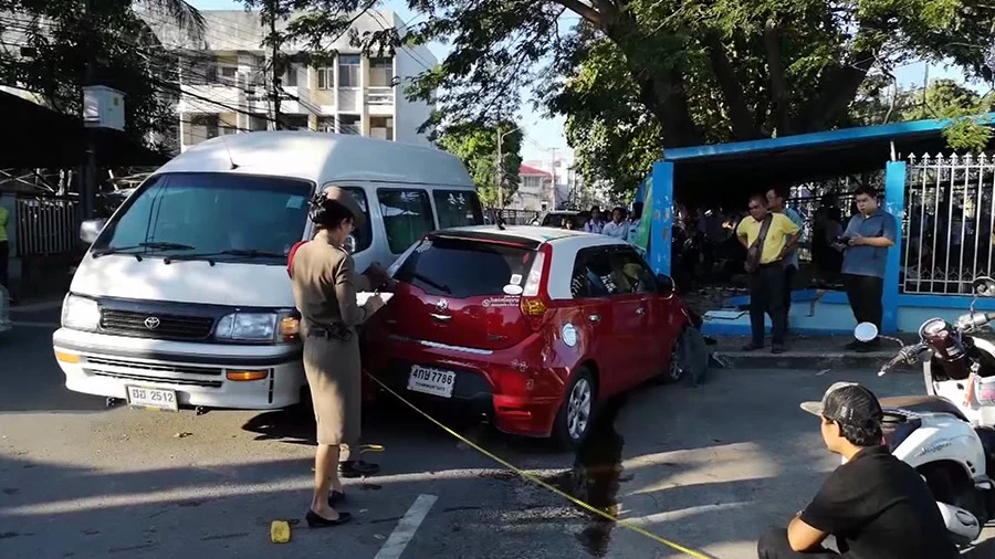 ขณะที่รถจักรยานยนต์ทั้งสองคันกำลังขับผ่านและรถตู้สีขาวเคลื่อนตัวอย่างช้าๆ ในช่องทางจราจรช่องซ้าย รถเก๋งคันเกิดเหตุซึ่งจอดห่างประมาณ 30 เมตรในช่องจราจรฝั่งตรงข้าม ขับออกมาหลังจากรับนักเรียนขึ้นรถสองคนและได้พุ่งอย่างแรงกระทั่งชนรถจักรยานยนต์แม่ค้าผลไม้ล้มลงและคนซ้อนท้ายกระเด็นไปที่ใต้ท้องรถตู้ จากนั้นพุ่งชนรถจักรยานยนต์นักเรียนที่กำลังขับกลับบ้าน ในที่สุดพุ่งชนรถตู้และเสยรั้วโรงเรียนล้มพัง เบื้องต้น คาดว่าคนขับพยายามเหยียบเบรกเพื่อชะลอรถ ก่อนถึงจุดทางข้ามซึ่งมีคนพลุกพล่านและรถสัญจรไปมาจำนวนมาก แต่เหยียบผิดตำแหน่งไปโดนคันเร่ง จึงทำให้รถพุ่งอย่างแรง