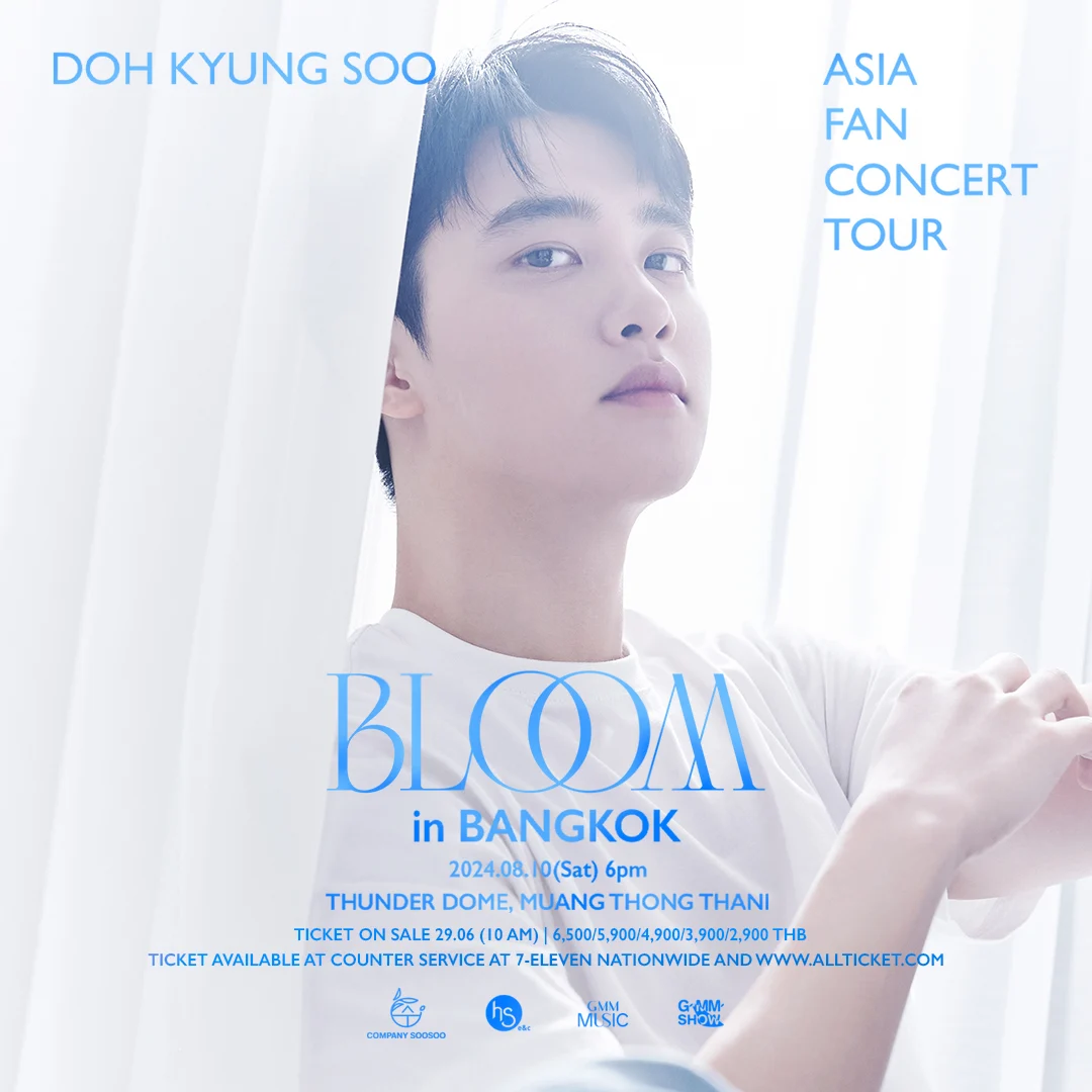 2024 DOH KYUNG SOO ASIA FAN CONCERT TOUR <BLOOM> in BANGKOK จะจัดขึ้นในวันที่ 10 สิงหาคม 2567 ณ ธันเดอร์โดม เมืองทองธานี ใครอยากเจอ โด คยองซู เตรียมตัวกดบัตร และลุ้นรับ Fan Benefits สุดฟินพร้อมกันในวันที่ 29 มิถุนายน 2567 นี้ ตั้งแต่เวลา 10.00 น. เป็นต้นไปผ่านทางเคาน์เตอร์เซอร์วิสในร้าน 7-Eleven ทุกสาขาทั่วประเทศ และ www.allticket.com บัตรราคา: 6,500 / 5,900 / 4,900 / 3,900 และ 2,900 บาท (บัตรนั่งทุกที่นั่ง) *ทุกที่นั่ง ทุกราคาบัตร รับ Official Poster, Photo Card และบัตรแข็งที่ระลึก ติดตามรายละเอียดเพิ่มเติมได้ที่: Facebook: GMM SHOW / TikTok: @gmmshow / Instagram: @gmmshow / X: @GMMSHOW_th