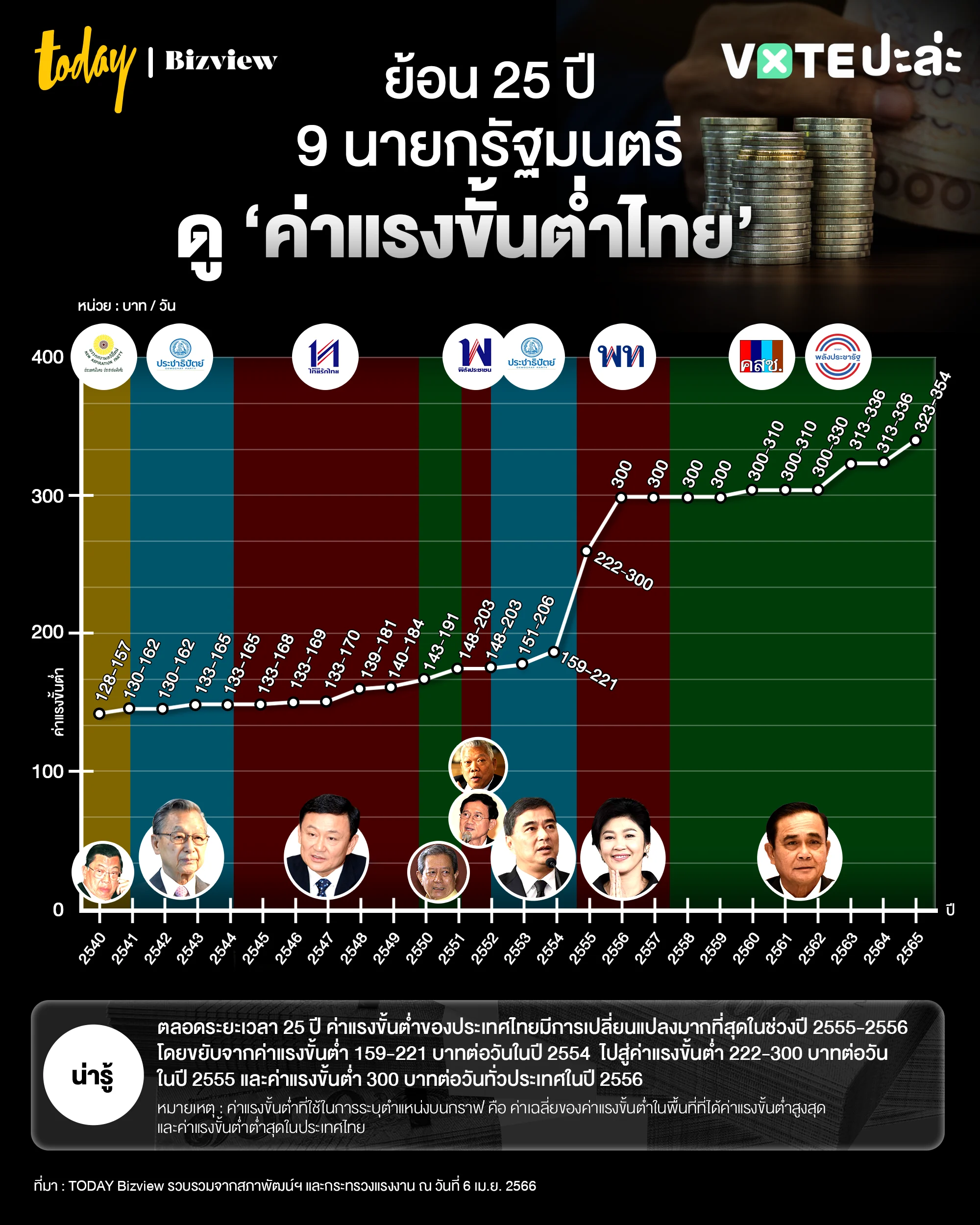 ตลอด 25 ปีที่ผ่านมาภายใต้การบริหารงานของรัฐบาลหลัก 9 ชุด นำโดยนายกรัฐมนตรีทั้งหมด 9 คน จาก 7 พรรคการเมือง ‘ค่าแรงขั้นต่ำ’ ก็มีการเปลี่ยนแปลงเป็นระยะ มากหรือน้อยแตกต่างกันตามช่วงเวลา ในวันที่ 14 พ.ค. นี้กำลังจะมีการเลือกตั้งทั่วไปเกิดขึ้นอีกครั้ง และแต่ละพรรคการเมืองต่างเสนอนโยบายค่าแรงขั้นต่ำแตกต่างกันออกไป