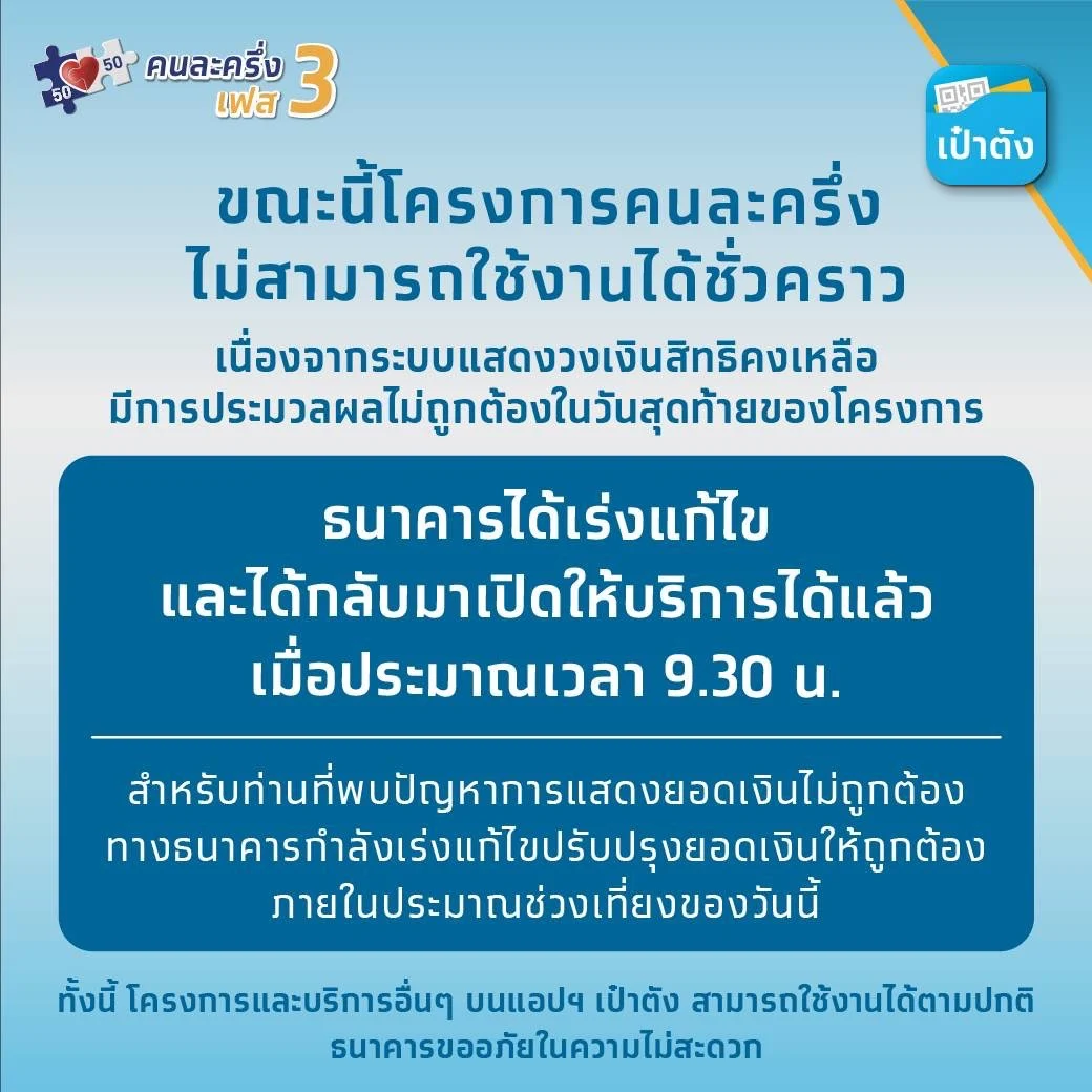 ขณะนี้โครงการคนละครึ่งไม่สามารถใช้ได้ชั่วคราวเนื่องจากระบบแสดงวงเงินสิทธิคงเหลือมีการประมวลผลไม่ถูกต้องในวันสุดท้ายของโครงการ ธนาคารได้เร่งแก้ไขและได้กลับมาเปิดให้บริการได้แล้วเมื่อประมาณเวลา 9.30 น. สำหรับผู้ที่พบปัญหาการแสดงยอดเงินไม่ถูกต้องทางธนาคารกำลังเร่งแก้ไขปรับปรุงยอดเงินให้ถูกต้องภายในประมาณช่วงเที่ยงของวันนี้