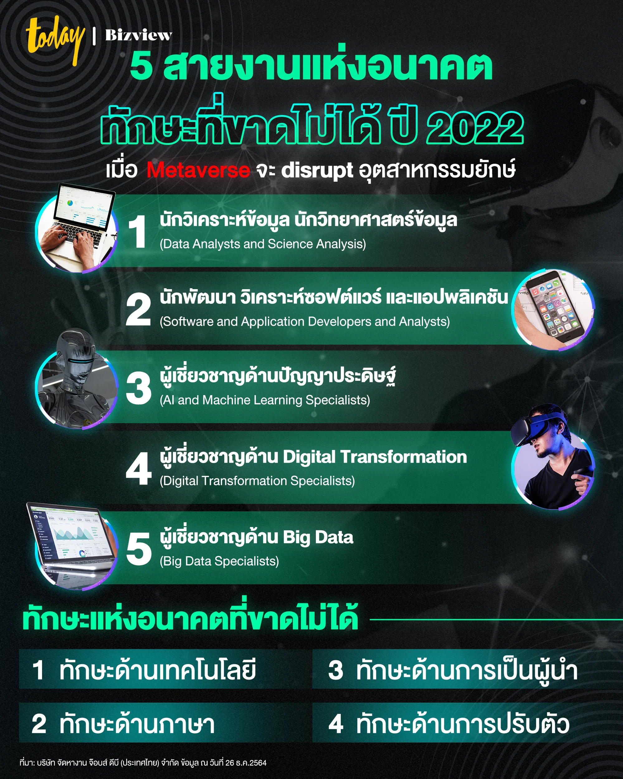 ล่าสุด บริษัท จัดหางาน จ๊อบส์ ดีบี (ประเทศไทย) จำกัด กูรูด้านการหางานงานตัวจริง ได้เปิดเผยกับ TODAY Bizview ถึงสายงานแห่งอนาคต ให้ตอบรับกับการเปลี่ยนแปลงของเศรษฐกิจและโลกดิจิทัล โดยเฉพาะกระแส ‘Metaverse’ หรือ ‘จักรวาลนฤมิต’ ที่เพิ่งเกิดใหม่เมื่อปีที่ผ่านมา และกำลังจะเข้ามาเปลี่ยนแปลงหลายอย่างในโลกใบนี้ ไม่ว่าจะแง่ธุรกิจหรือการใช้ชีวิต