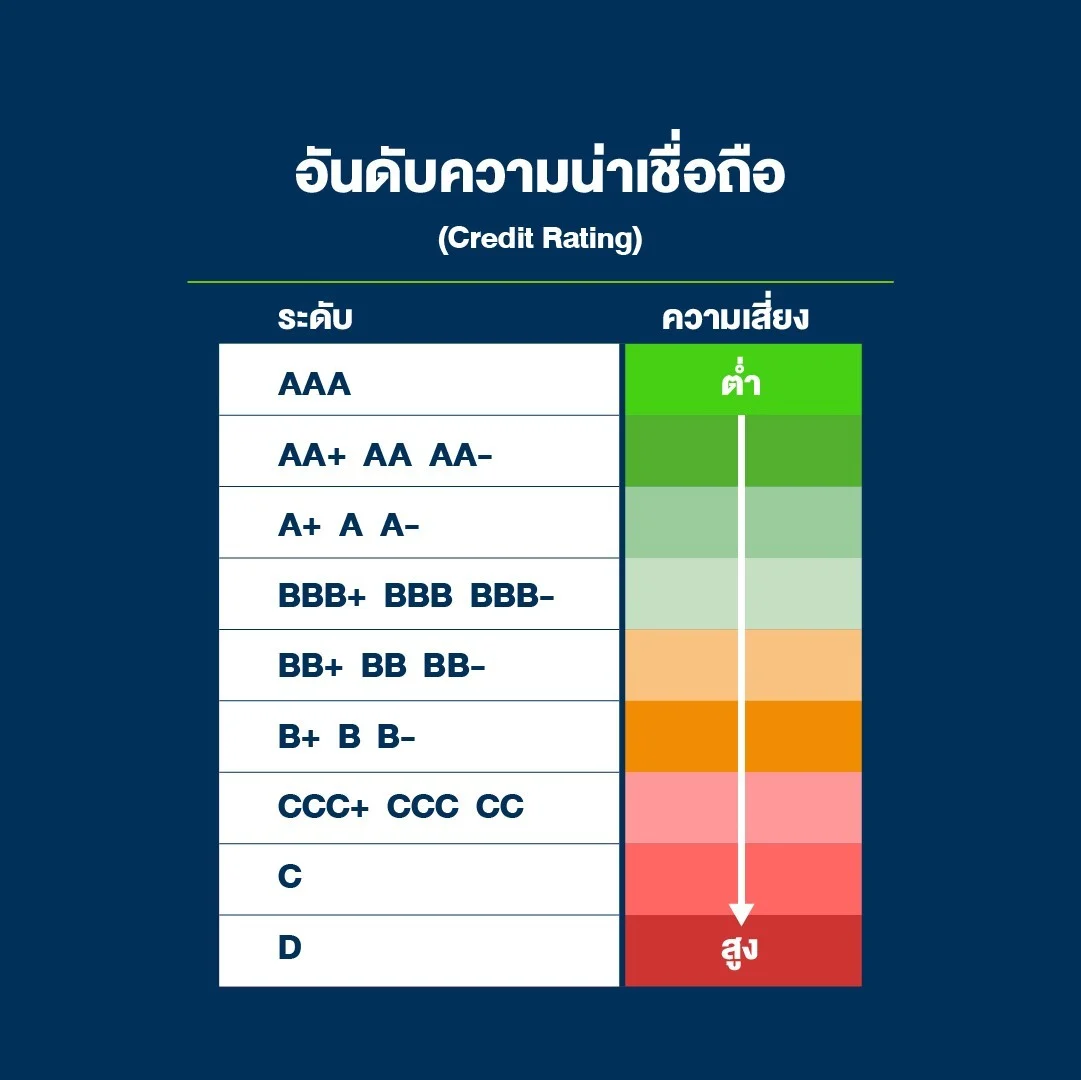 ยกตัวอย่าง ตราสารหนี้ คือ การให้เจ้าของกิจการยืมเงินไปทำธุรกิจ โดยคนที่ลงทุนนั้นมีสถานะเป็น “เจ้าหนี้” ดังนั้น คุณจะมั่นใจได้อย่างไรว่า ลูกหนี้คนนี้เมื่อผ่านไป 1 ปี เขาจะมีเงินมาคืนเรา มันจึงมีการจัดอันดับความน่าเชื่อถือ (Credit Rating) เป็น AAA, AA+, AA, AA-, BBB เป็นต้น ซึ่งเราสามารถเลือกดูได้
