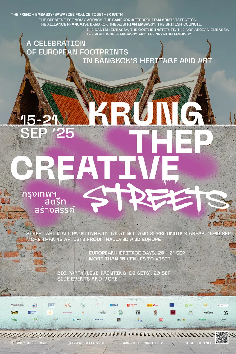 งานกรุงเทพฯ สตรีท สร้างสรรค์ จัดขึ้นระหว่างวันที่ 3–21 กันยายน 2568 โดยหัวใจสำคัญของกิจกรรมคือการเปลี่ยนกรุงเทพมหานครให้เป็นหอศิลป์กลางแจ้ง ด้วยผลงานจิตรกรรมฝาผนังจากศิลปินสตรีทอาร์ตจากไทยและยุโรปในย่านสำคัญต่าง ๆ ได้แก่ เจริญกรุง ตลาดน้อย ทรงวาด สาทรใต้ สุรวงศ์ และลุมพินี กิจกรรมจะดำเนินต่อเนื่องไปจนถึงช่วงสำคัญในวันที่ 20–21 กันยายน เนื่องในวันมรดกยุโรป ประจำปี 2568 ซึ่งเปิดโอกาสให้ประชาชนทั่วไปสามารถเข้าชมอาคารประวัติศาสตร์และการจัดแสดงผลงานสตรีทอาร์ตและศิลปะร่วมสมัย โดยผู้เข้าร่วมจะได้ค้นพบทั้งมรดกทางประวัติศาสตร์และจิตวิญญาณแห่งความคิดสร้างสรรค์ของกรุงเทพมหานคร ตลอดจนสะท้อนให้เห็นถึงความสัมพันธ์อันยาวนานระหว่างประเทศไทยและยุโรป