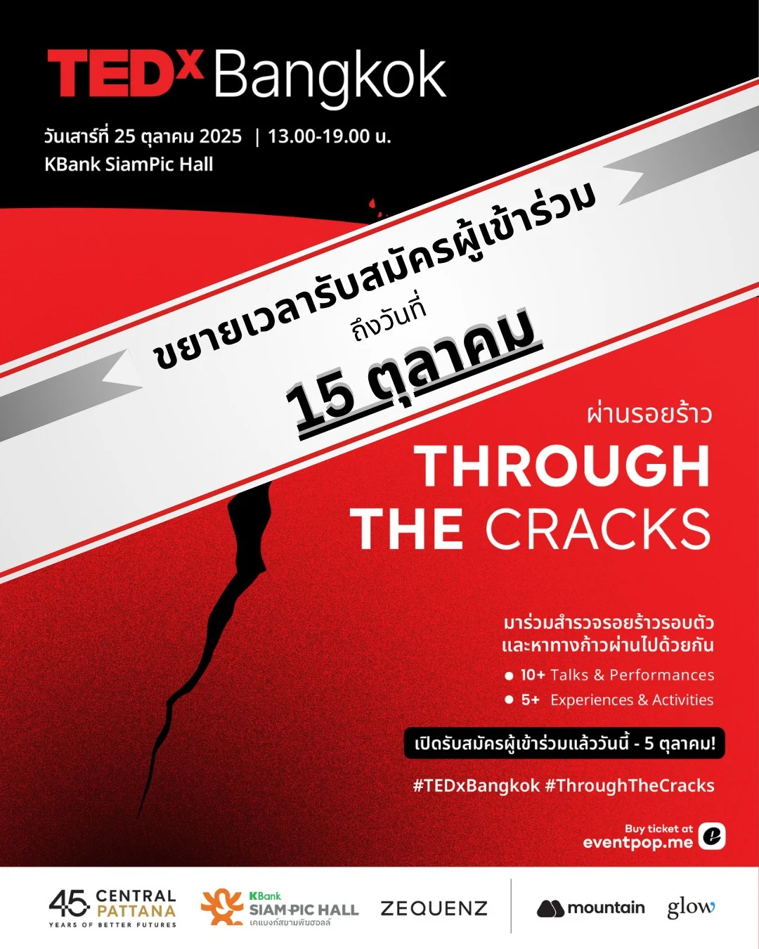 แล้วพบกันใน TEDxBangkok 2025 “Through the Cracks ผ่านรอยร้าว” วันที่ 25 ตุลาคม 2568 เวลา 13.00 น. – 19.00 น. ณ เคแบงก์สยามพิฆเนศฮอลล์ (อาคารสยามสแควร์วัน ชั้น 7) สามารถติดตามความเคลื่อนไหวกิจกรรมได้ที่ https://www.facebook.com/tedxbangkok/ และเว็บไซต์ www.tedxbangkok.com ร่วมกันแสดงความคิดเห็นผ่าน Hashtag #TEDxBangkok #ThroughTheCracks