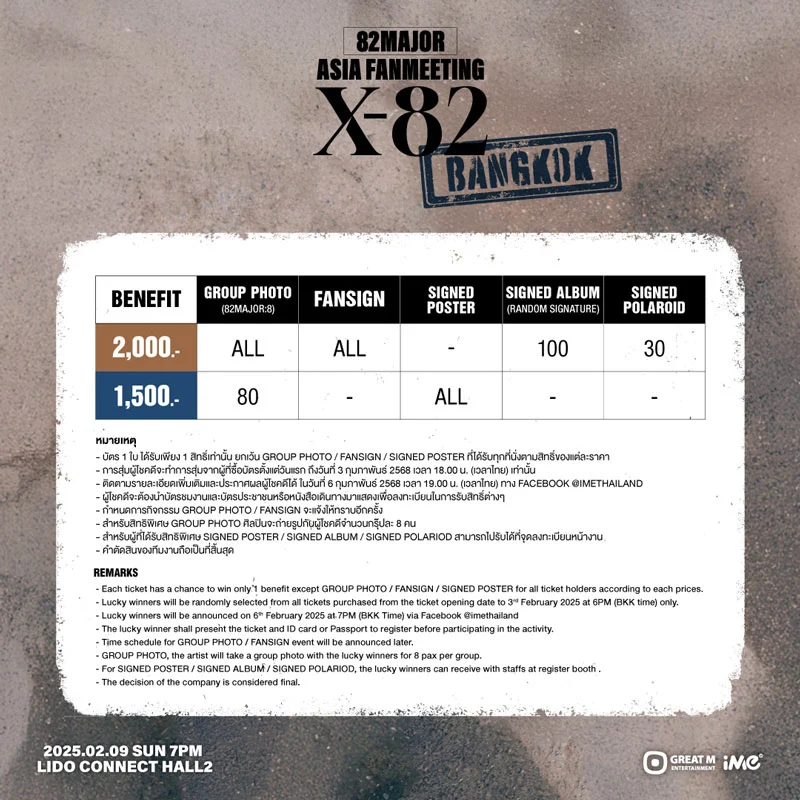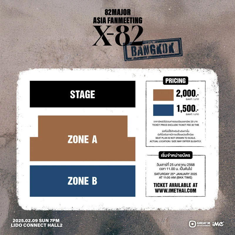 หนุ่มๆ ชวนขนาดนี้!! 82DE ชาวไทย ต้องรีบเคลียร์คิวล็อกวันมาให้กำลังใจ และเป็นส่วนหนึ่งของงานแฟนมีตติ้งครั้งนี้แล้ว โดยเปิดจำหน่ายบัตรวันเสาร์ที่ 25 มกราคม 2568 เวลา 11.00 น. เป็นต้นไป ผ่านทาง www.imethai.com บัตรราคา 2,000 และ 1,500 บาท (บัตรนั่งทุกที่นั่ง)