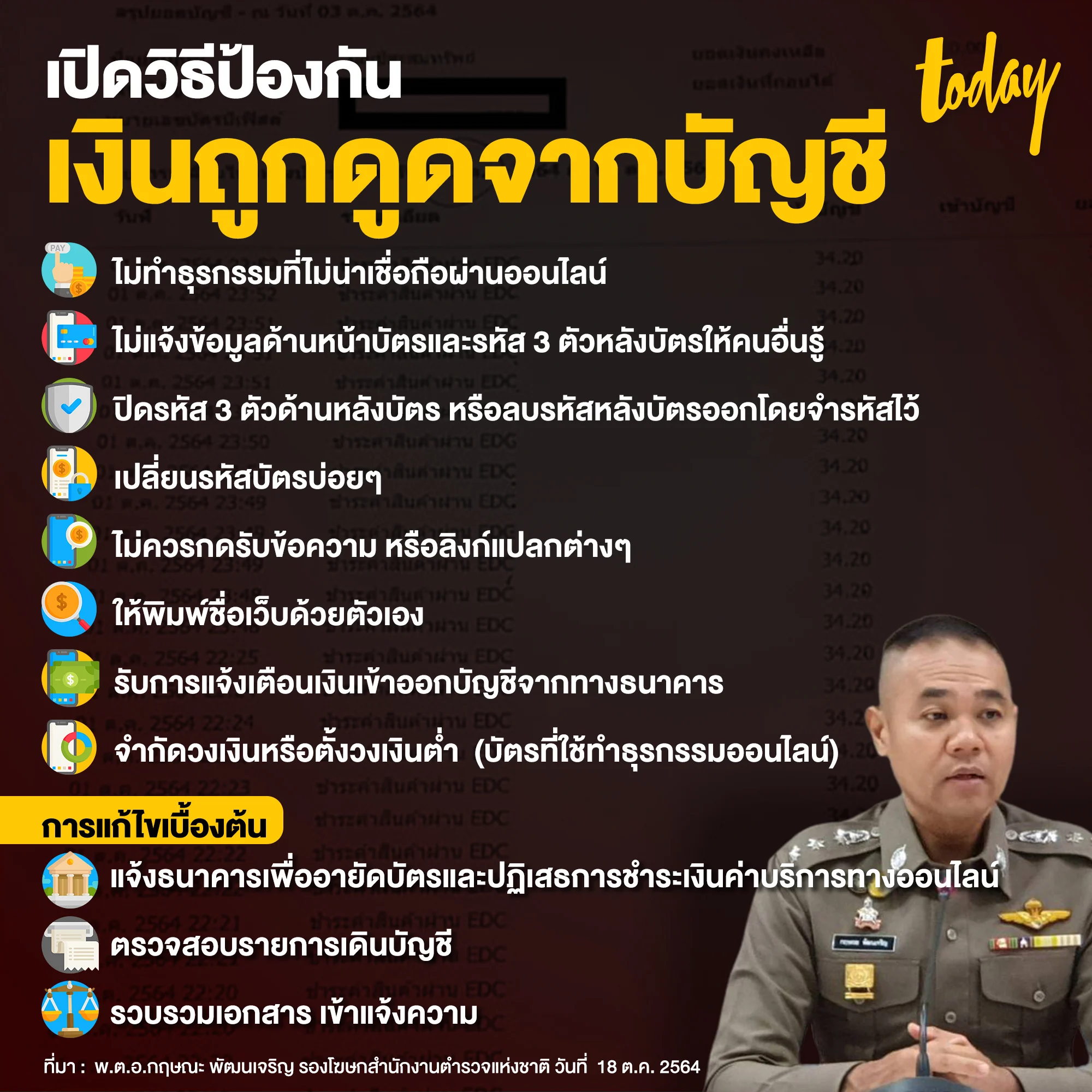 ตร. เปิดวิธีป้องกันเงินหายจากบัญชีเบื้องต้น พร้อมชี้แจง เงินไหลจากบัญชีบัตรเดบิต เกิดจากการทำธุรกรรมออนไลน์ ไม่ได้เกิดจากข้อมูลรั่วไหลธนาคาร และแอปฯ ดูดเงิน