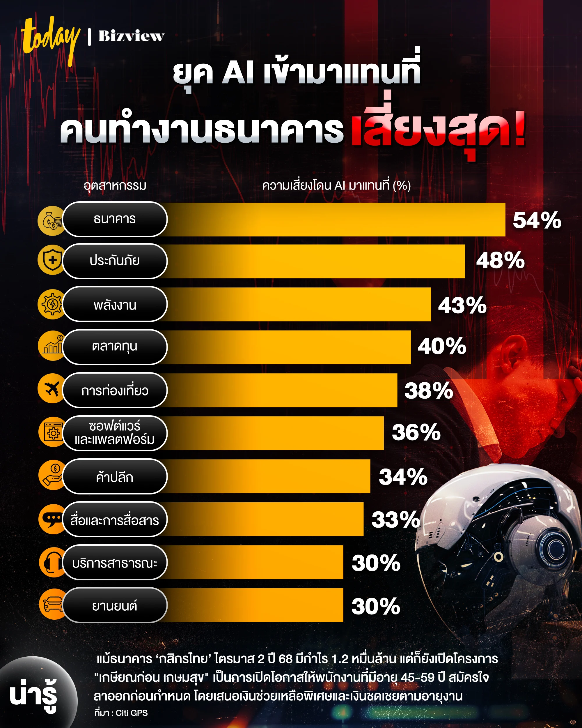 โดยเฉพาะภาคการเงินที่ได้รับผลกระทบมากที่สุด งานในธนาคารมีโอกาสถูกทำให้เป็นอัตโนมัติสูงถึง 54% ขณะที่ประกันภัยอยู่ที่ 48% และตลาดทุนอยู่ที่ 40% ตัวเลขเหล่านี้สะท้อนให้เห็นถึงความเป็นไปได้ที่เทคโนโลยีจะเข้ามาแทนที่งานซ้ำซ้อนหรืองานที่ต้องใช้ข้อมูลจำนวนมาก
