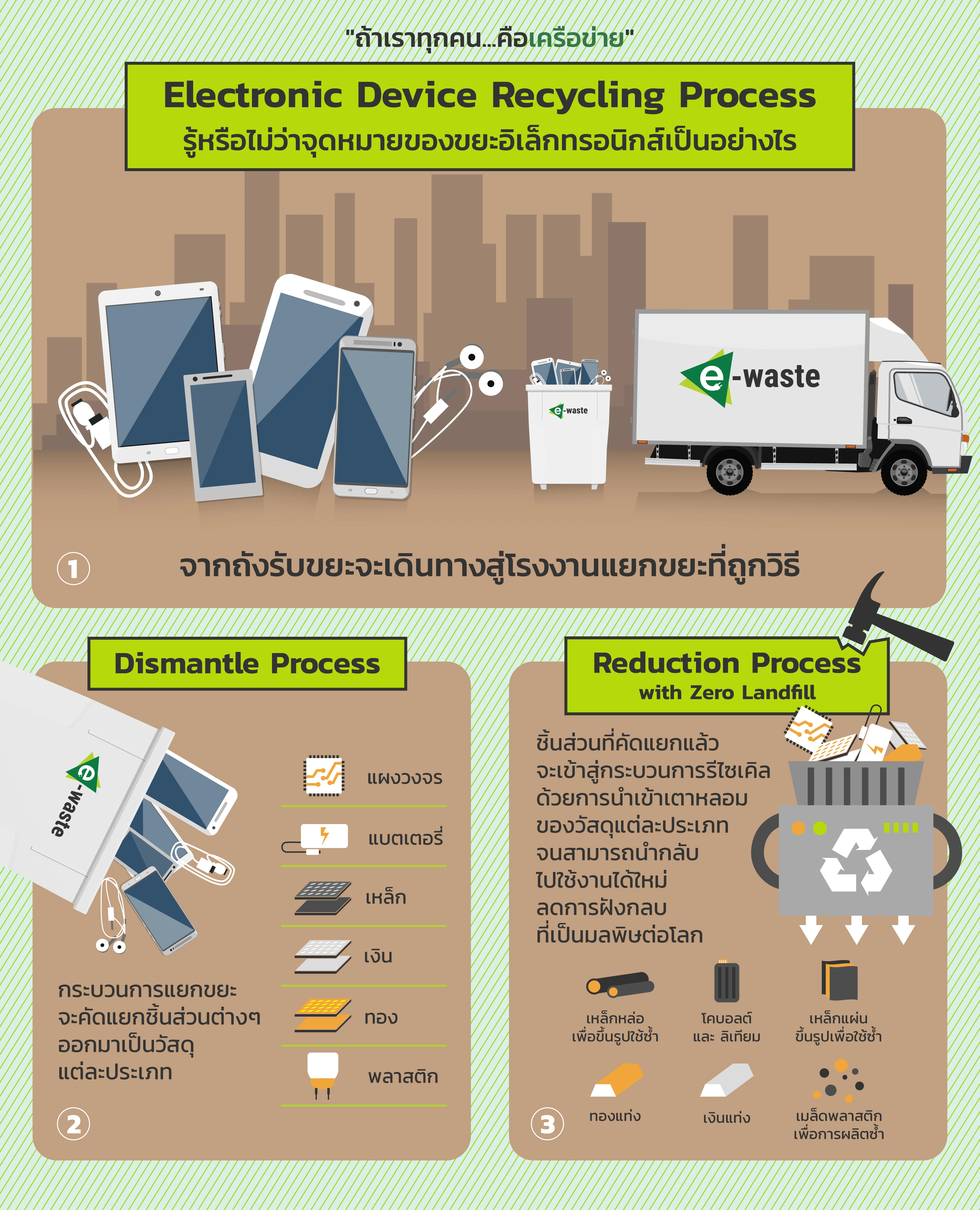 “จริงๆ แล้วขยะพวกตู้เย็น คอมพิวเตอร์ พัดลม เครื่องปรับอากาศ ก็อยู่ในข่ายที่เรียกว่าขยะอิเล็กทรอนิกส์ทั้งหมด ถ้านับโดยน้ำหนัก พวกนี้จะเยอะ แต่ถ้านับโดยปริมาณจริงๆ แล้ว ขยะจำพวก โทรศัพท์มือถือ เยอะมากที่สุด จำนวนซิมโทรศัพท์มือถือที่ใช้กันในไทยมีอยู่ประมาณ 90 กว่าล้านซิม ซึ่งแน่นอนว่าจะมีเครื่องโทรศัพท์มือถือไม่ต่ำกว่า 80 กว่าล้านเครื่องที่หมุนเวียนอยู่ คำถามคือมือถือ 80 ล้านเครื่องนี้ สมมติว่าเราทิ้ง แล้วมันไปไหนต่อ นี่คือสิ่งที่เราเข้ามาให้ความสนใจ ซึ่งถ้าฝังกลบมันจะมีทั้งตะกั่ว แคดเมียม ปรอท เป็นต้น สารพวกนี้เป็นสารอันตรายที่ส่งผลต่อทั้งสุขภาพของเราและสิ่งแวดล้อม ดังนั้น จึงอยากให้มั่นใจว่า ผู้ที่รับต่อจากเอไอเอสอย่างเทส สามารถกำจัดขยะอิเล็กทรอนิกส์ได้อย่างถูกวิธี”