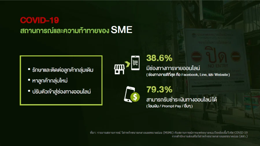 ข้อมูลจากสำนักงานส่งเสริมวิสาหกิจขนาดกลางและขนาดย่อม หรือ สสว. รายงานสถานการณ์ของวิสาหกิจขนาดกลางและขนาดย่อม ในช่วงการแพร่ระบาดของโควิดเมื่อปี 2563 ว่า 61.4% ยังไม่มีช่องทางการขายผ่านออนไลน์ ในขณะที่ มีถึง 79.3% ที่สามารถรับชำระเงินผ่านทางออนไลน์ได้แล้ว โดยมีเพียง 38.6% ที่มีช่องทางขายบนออนไลน์ และช่องทางที่ขายดีที่สุดคือ บน Facebook, LINE และ Website ตามลำดับ