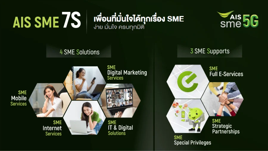 “ผู้ประกอบการรายย่อย หรือ SME ที่แม้จะเป็นกลุ่มธุรกิจแรกๆ ที่ได้รับผลกระทบโดยตรง ทั้งจากมาตรการล็อกดาวน์ประเทศ และภาวะเศรษฐกิจตกต่ำ แต่ก็นำมาซึ่งโอกาสที่จะปรับเปลี่ยนรูปแบบการทำธุรกิจด้วยเครื่องมือดิจิทัลโซลูชัน หรือออนไลน์ เข้ามาเป็นส่วนผสมใหม่ของการดำเนินธุรกิจให้อยู่รอดและสร้างการเติบโตได้อย่างยั่งยืนเช่นกัน เอไอเอสซึ่งมีโหมด AIS SME อยู่แล้ว จึงได้เปิดตัวแคมเปญใหม่ล่าสุด ประกอบด้วย 7 โซลูชัน สำหรับธุรกิจ SME โดยเฉพาะ เพื่อเป็นเพื่อนที่มั่นใจได้ทุกเรื่อง SME”