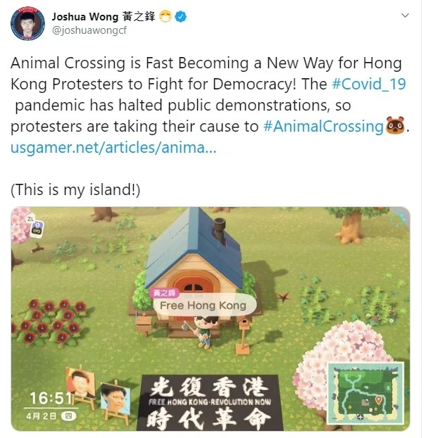 หว่องทวีตภาพจากเกม Animal Crossing และบอกว่า ตอนนี้กำลังเล่นเกมอยู่ และการชุมนุมย้ายมาอยู่ในโลกออนไลน์ บนเกาะของเขาเป็นภาพถ่ายของแครี่ หลำ ผู้ว่าการเกาะฮ่องกง และมีโปสเตอร์ที่มีข้อความว่า “ปลดปล่อยฮ่องกงให้เป็นอิสระ ปฏิรูปเดี๋ยวนี้” และมีตัวละครในเกมพูดว่า “ปลดปล่อยฮ่องกงให้เป็นอิสระ”