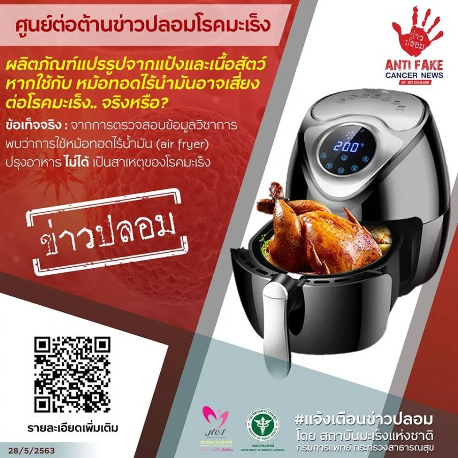 วันที่ 6 มิ.ย. 63 กรมการแพทย์ โพสต์ชี้แจง หลังมีข่าวปรากฏตามสื่อต่าง ๆ เกี่ยวกับประเด็น “ผลิตภัณฑ์แปรรูปจากแป้งและเนื้อสัตว์หากใช้กับหม้อทอดไร้น้ำมันอาจเสี่ยงต่อมะเร็ง” กรมการแพทย์ โดย สถาบันมะเร็งแห่งชาติ ได้ตรวจสอบข้อมูลวิชาการพบข้อเท็จจริง คือ การใช้หม้อทอดไร้น้ำมัน (air fryer) ปรุงอาหารไม่ได้เป็นสาเหตุของโรคมะเร็ง