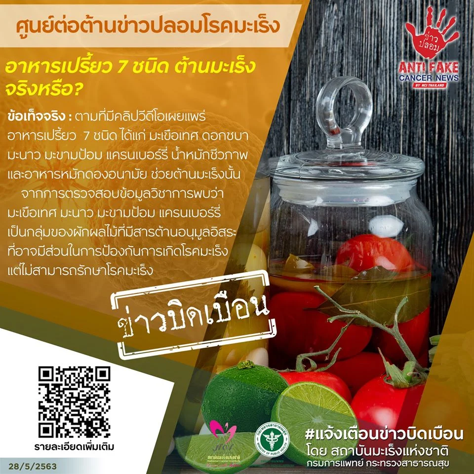 สถาบันมะเร็งแห่งชาติ แจ้งเตือนข่าวบิดเบือน หลังมีข้อมูลอาหารเปรี้ยว 7 ชนิด ต้านมะเร็ง