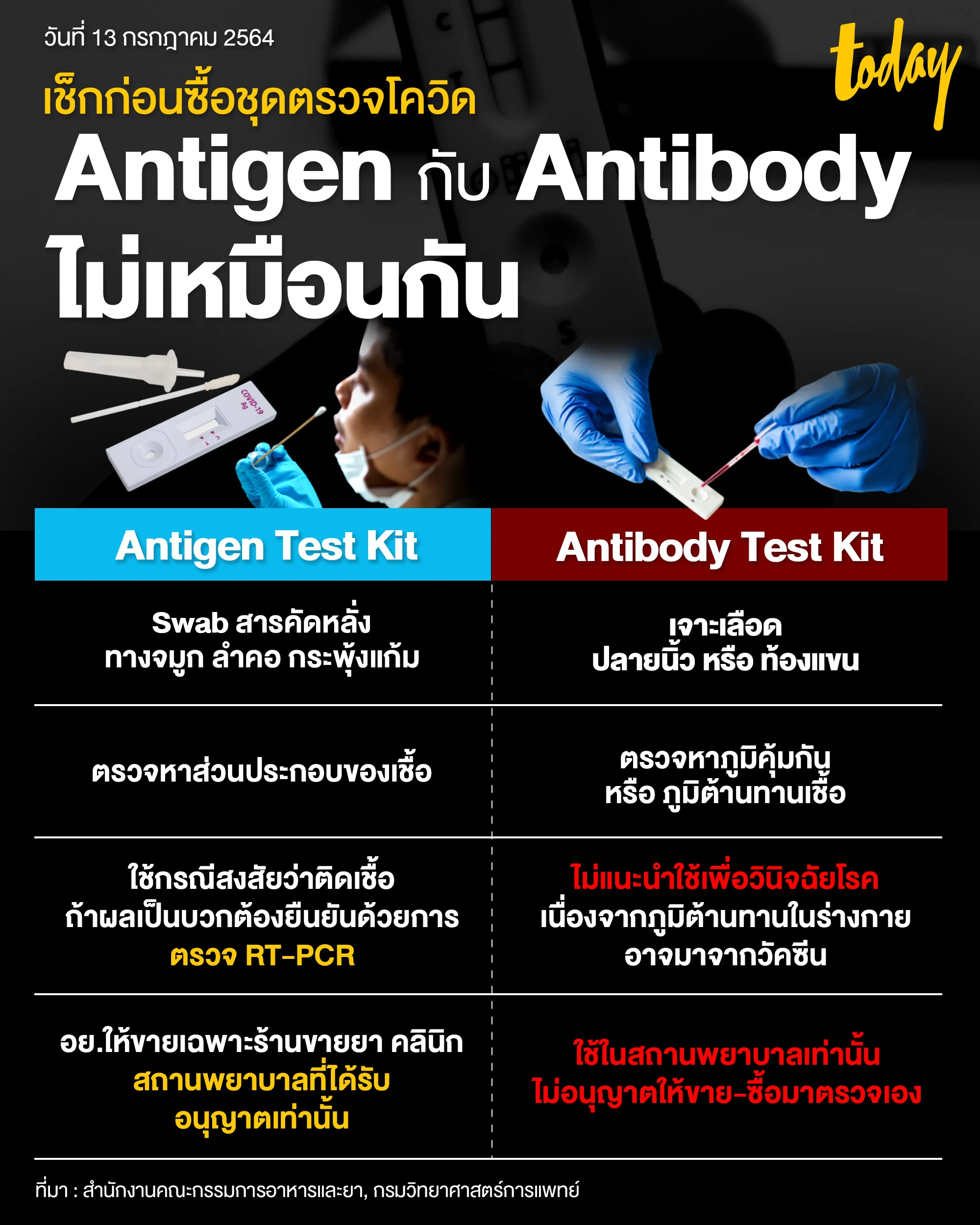 ตรวจสอบก่อนซื้อชุดตรวจโควิด Antigen กับ Antibody ไม่เหมือนกัน โดยเฉพาะ Antibody Test Kit ไม่อนุญาตให้ขาย หรือซื้อไปตรวจเอง อย. ชี้ หากพบมีการลักลอบขายมีความผิด โทษสูงสุดคุก 2 ปี