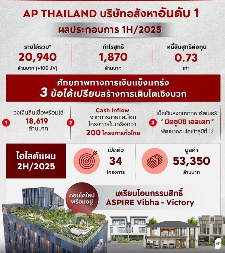 เอพี ไทยแลนด์ เผยผลการดำเนินงานครึ่งปีแรก 2568 ยืนหนึ่งในอุตสาหกรรมด้วยรายได้รวม 20,940 ล้านบาท และกำไรสุทธิ 1,870 ล้านบาท สัดส่วนหนี้สินสุทธิต่อทุนต่ำเพียง 0.73 เท่า ตอกย้ำความแข็งแกร่งด้วยเสถียรภาพทางการเงินและสภาพคล่องสูงจาก 3 ข้อได้เปรียบหลัก ได้แก่ วงเงินสินเชื่อพร้อมใช้ที่ยังไม่เคยเบิกมากถึง 18,619 ล้านบาท การลงทุนพัฒนาคอนโดระยะยาวร่วมกับพันธมิตร มิตซูบิชิ เอสเตท ต่อเนื่องเป็นปีที่ 12 และกระแสเงินสดจากการขายและโอนกว่า 200 โครงการทั่วประเทศ ท่ามกลางเศรษฐกิจโลกที่ผันผวน เอพียังเดินหน้าวางแผนเปิดตัว 34 โครงการใหม่ มูลค่ารวม 53,350 ล้านบาท ครอบคลุมบ้านเดี่ยว บ้านแฝด ทาวน์โฮม และคอนโด ไฮไลต์สำคัญคือกลุ่มธุรกิจทาวน์โฮมและบ้านแฝดที่เตรียมเปิดแบบบ้านใหม่ต่อเนื่อง หลังประสบความสำเร็จกับ “บ้านกลางเมือง THE EDITION สาทร–กัลปพฤกษ์” ดีไซน์ XAVIER ทาวน์โฮม 3 ชั้นเล่นระดับ และกลุ่มบ้านเดี่ยวที่เตรียมเปิดตัวแบรนด์ “BEON” แนวคิด Ultra Volume พร้อมดีไซน์ชั้นลอย Vertiplex ส่วนกลุ่มคอนโดเตรียมเปิด 5 โครงการใหม่ และพร้อมโอน ASPIRE วิภา–วิคตอรี่ มูลค่า 2,300 ล้านบาท ตลอดปี 2568