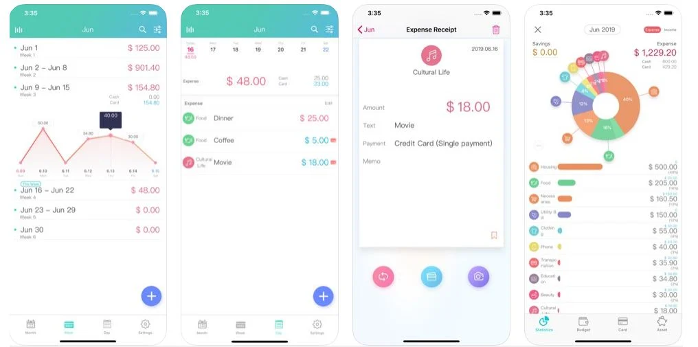 มากไปกว่านั้นคือสามารถปรับดูรายรับและรายจ่ายเป็นกราฟได้ ซึ่งออกแบบมาได้สบายตาดี นอกจากนี้ แอปฯ ยังมีฟังก์ชั่น ‘Budget’ ให้เรากำหนดงบประมาณให้กับรายจ่ายประเภทต่างๆ ได้ ทำให้สามารถควบคุมค่าใช้จ่ายได้ก่อนที่มันจะเกินงบ ‘card’ บันทึกค่าใช้จ่ายจากการใช้งานเครดิตการ์ด และ ‘Asset’ รวมรวบสินทรัพย์ที่เรามีอยู่ เพื่อให้เราสามารถประเมินการใช้จ่ายและลงทุนในระยะยาวของชีวิตได้อย่างเหมาะสม