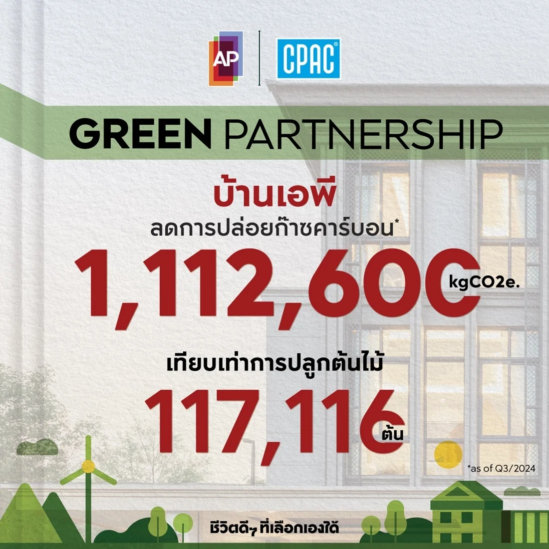 โดยล่าสุดในปี 2567 (มกราคม – กันยายน) เอพีได้นำนวัตกรรมนี้มาใช้กับบ้านเอพีกว่า 56 โครงการ ซึ่งสามารถลดการปล่อยก๊าซคาร์บอนไดออกไซด์ได้ถึง 1,112,600 กิโลกรัมคาร์บอนไดออกไซด์เทียบเท่า (kgCO2e) หรือเทียบเท่ากับการปลูกต้นไม้กว่า 117,116 ต้น ด้วยความมุ่งหวังที่จะลดการปล่อยก๊าซคาร์บอนไดออกไซด์ของประเทศไทยเพื่อก้าวสู่สังคมคาร์บอนต่ำ พร้อมพัฒนาองค์กรและสร้างความยั่งยืนในทุกกระบวนการตามหลัก ESG เพื่อให้ลูกบ้านเอพีและสังคมมีชีวิตดีๆ ไปด้วยกัน