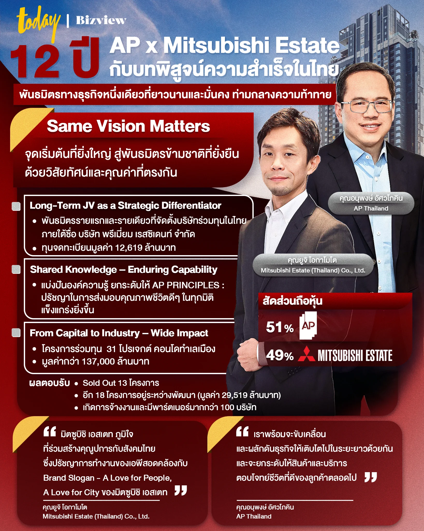 TODAY Bizview ชวนดูเบื้องหลังความสำเร็จนี้ นอกเหนือจากความสำเร็จทางตัวเลขที่โดดเด่น คือวิสัยทัศน์ร่วมกันของสองผู้นำ คุณอนุพงษ์ อัศวโภคิน และ คุณยูจิ โอกาโมโต ที่พร้อมจะแบ่งปันทุกจิกซอว์แห่งความสำเร็จครั้งนี้