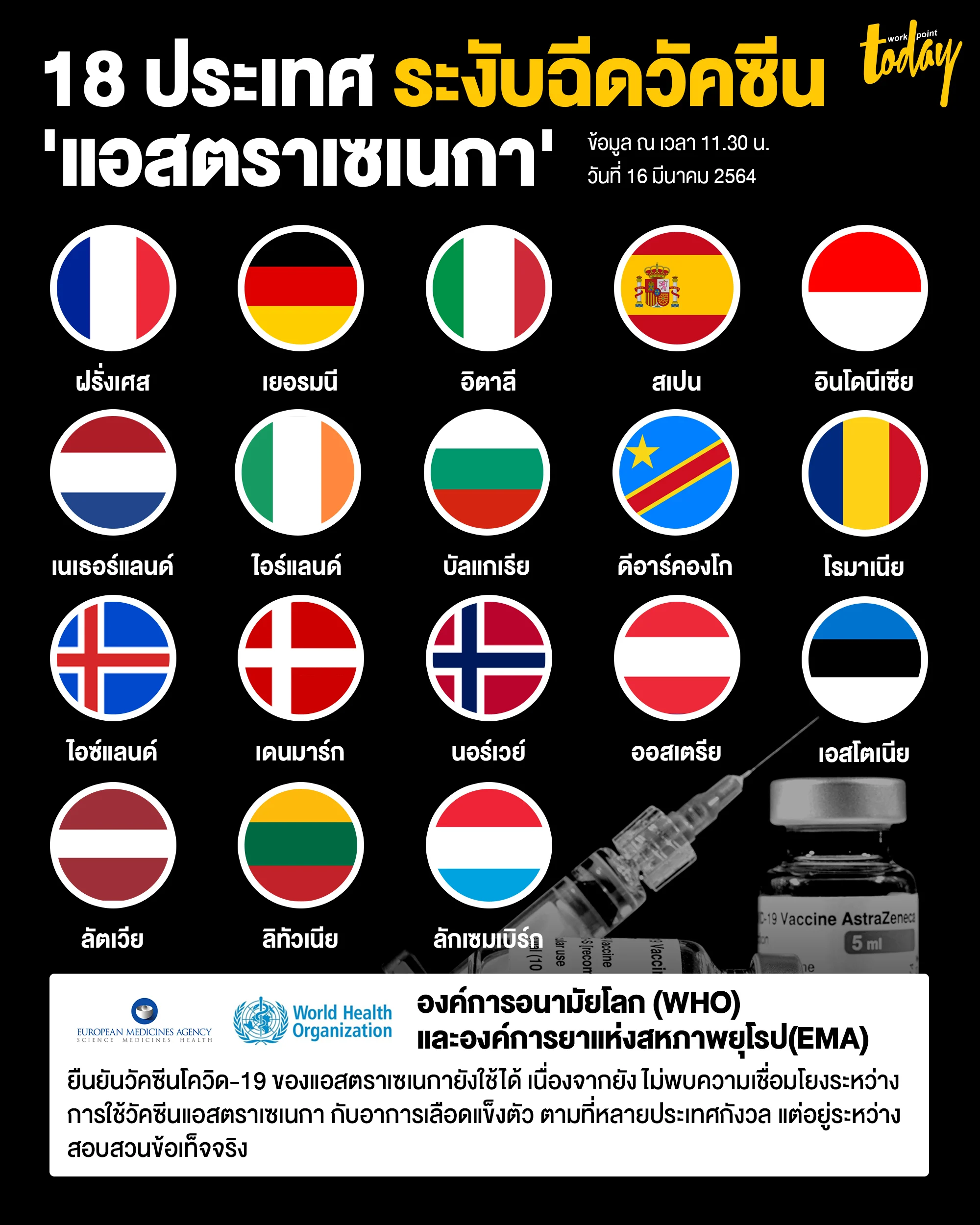 5.) องค์การยาแห่งสหภาพยุโรป (EMA) แนะนำว่าควรใช้วัคซีนโควิด-19 ของแอสตราเซเนกาต่อไป แต่ก็จะสอบสวนเหตุที่เกิดขึ้น โดยจะมีการประชุมกันในวันพฤหัสบดีนี้ (18 มี.ค.) ซึ่งเบื้องต้นองค์การยาแห่งสหภาพยุโรปเปิดเผยสถิติจนถึงวันที่ 10 มีนาคมที่ผ่านมาว่า พบผู้มีอาการเลือดแข็งตัว 30 ราย จากจำนวนผู้ฉีดวัคซีนแอสตราเซเนกาในยุโรปแล้วเกือบ 5 ล้านคน