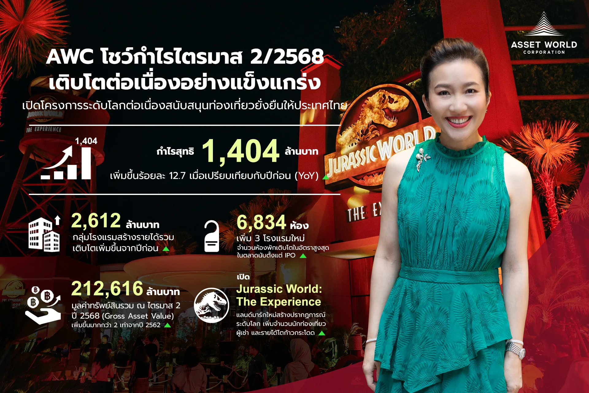 และล่าสุดได้เปิดตัว “Jurassic World: The Experience” และ “Hatch Dome” แลนด์มาร์กระดับโลกแห่งใหม่ที่โครงการเอเชียทีค เดอะ ริเวอร์ฟร้อนท์ เดสติเนชั่น สร้างปรากฏการณ์ความสนุกสุดยิ่งใหญ่ต้อนรับทุกคนในครอบครัว สนับสนุนกลยุทธ์การดึงดูดนักท่องเที่ยวตลอดทั้งวัน เพื่อเพิ่มการเติบโตของรายได้และจำนวนผู้เช่าก้าวกระโดด รวมถึงการเติบโตของรายได้จากโรงแรมในกลุ่มรีสอร์ท ระดับลักชัวรี ซึ่งยังคงดึงดูดนักท่องเที่ยวคุณภาพสูงได้ต่อเนื่อง โดยเฉพาะโรงแรมในเกาะสมุย และรายได้จากธุรกิจอาหารและเครื่องดื่มที่เติบโตสูงขึ้น รวมถึงการสร้างกระแสเงินสดที่แข็งแกร่งและมั่นคงของกลุ่มธุรกิจคอมเมอร์เชียล ซึ่งสามารถเพิ่มอัตราการเช่าพื้นที่และรายได้ค่าเช่าที่เพิ่มขึ้น จากการเสริมกลยุทธ์ทางการตลาดเพื่อสร้าง AWC’s Lifestyle Destination ที่โดดเด่น
