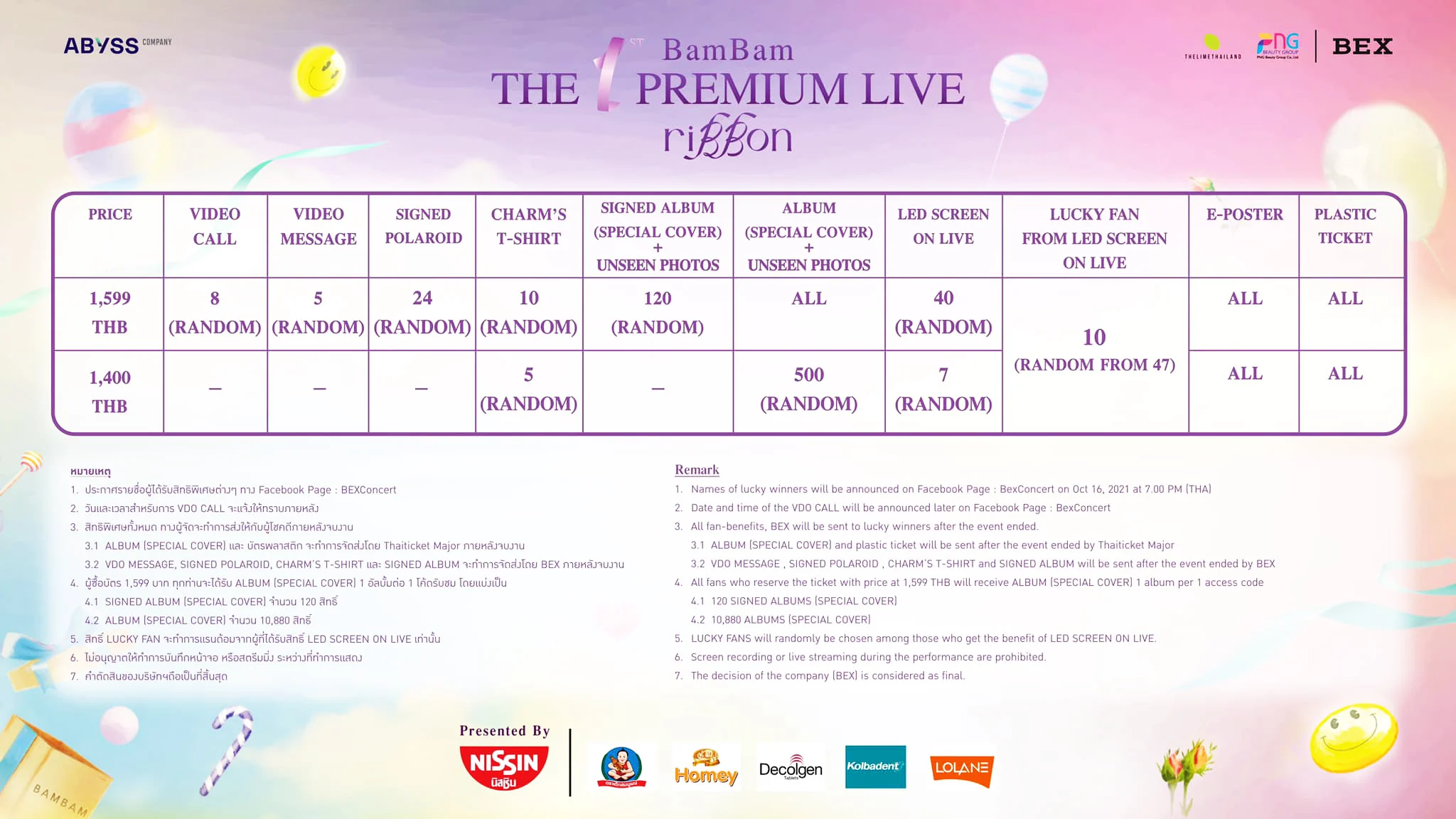 แบมแบมพูดเชิญชวนขนาดนี้แล้ว ก็รีบพุ่งตัวไปจับจองบัตรกันได้เลย! บัตร VIP 1,599 บาท พร้อมสิทธิพิเศษมากมายที่แฟนแบมแบมตัวจริงห้ามพลาด! บัตร 1 ใบสามารถลุ้นรับสิทธิ์ได้ทั้ง Video Call / Video Message / Signed Polaroid / Charm’s T-shirt / Signed Album / Lucky Fan From LED Scene