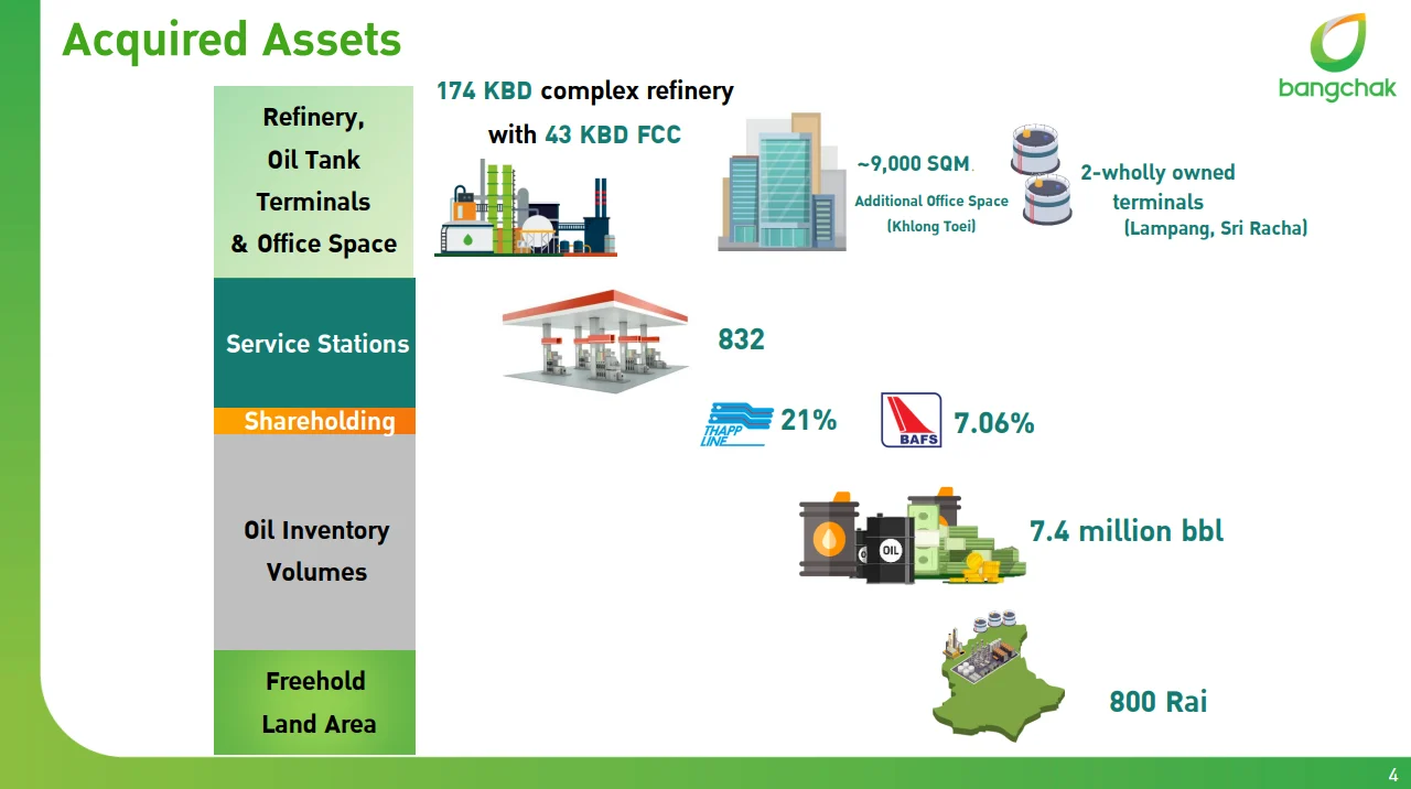 สินทรัพย์ของเอสโซ่ที่บางจากได้มา โดยเฉพาะโรงกลั่นน้ำมัน ที่เมื่อรวมกับของบางจากเองแล้ว ก็จะทำให้บางจากกลายเป็นบริษัทที่มีกำลังการกลั่นน้ำมันสูงสุดในประเทศรวมเกือบ 300,000 บาร์เรลต่อวัน
